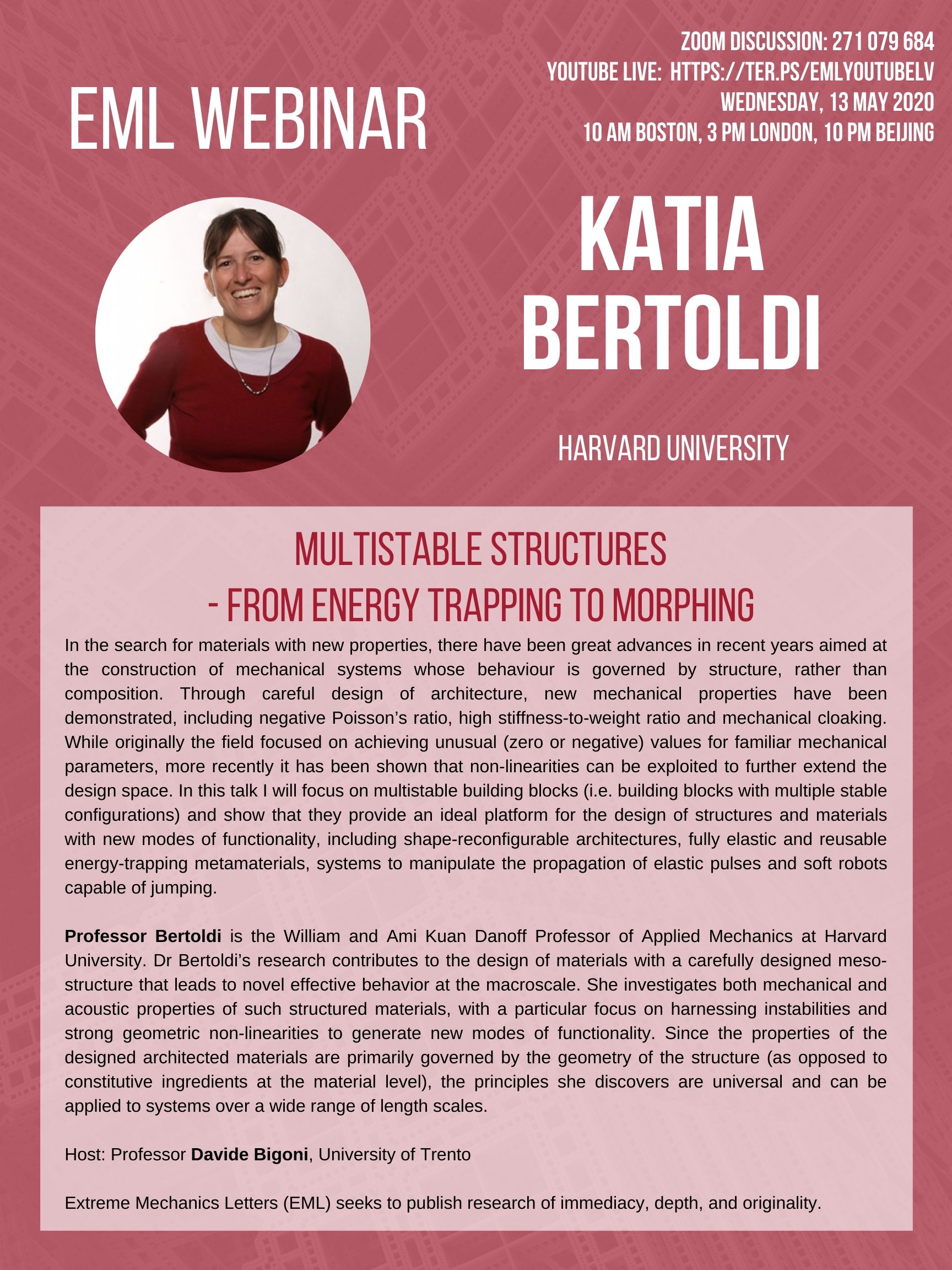 EML Webinar on May 13, 2020 will be given by Prof. Katia Bertoldi at Harvard University via Zoom meeting.