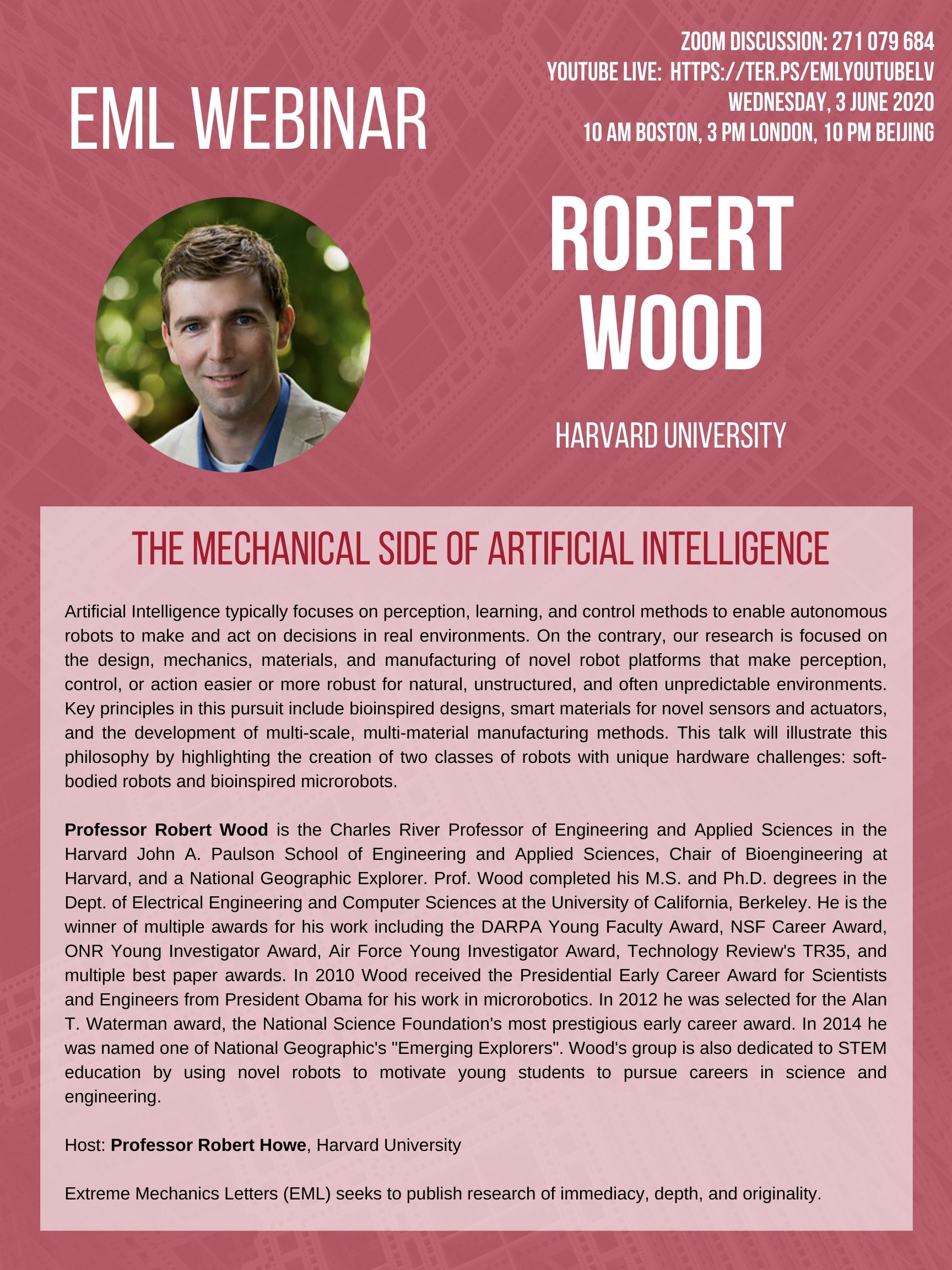 EML Webinar on June 3, 2020 will be given by Prof. Rob Wood at Harvard University via Zoom meeting. Discussion leader: Rob Howe, Harvard.