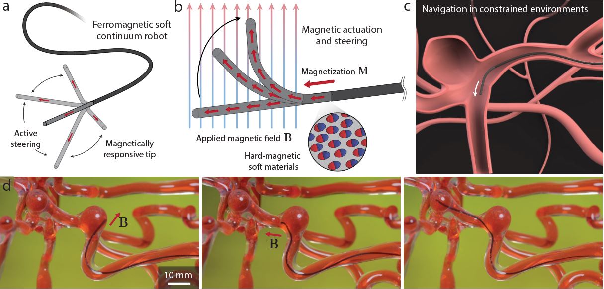 Stroke is #1 cause of long-term disability and #4 cause of death in the US. Most of the patients are not treated in time due to unavailability of professional neurosurgeons on site. We have developed a ferromagnetic soft continuum robot for tele-operated and autonomous navigation and treatment of strokes. The foundation is the hard-magnetic elastica theory which offers a fast and accurate prediction of the large deformation of the ferromagnetic soft continuum robot. Please check our recent paper at JMPS. https://authors.elsevier.com/a/1bETm57Zjx1FL