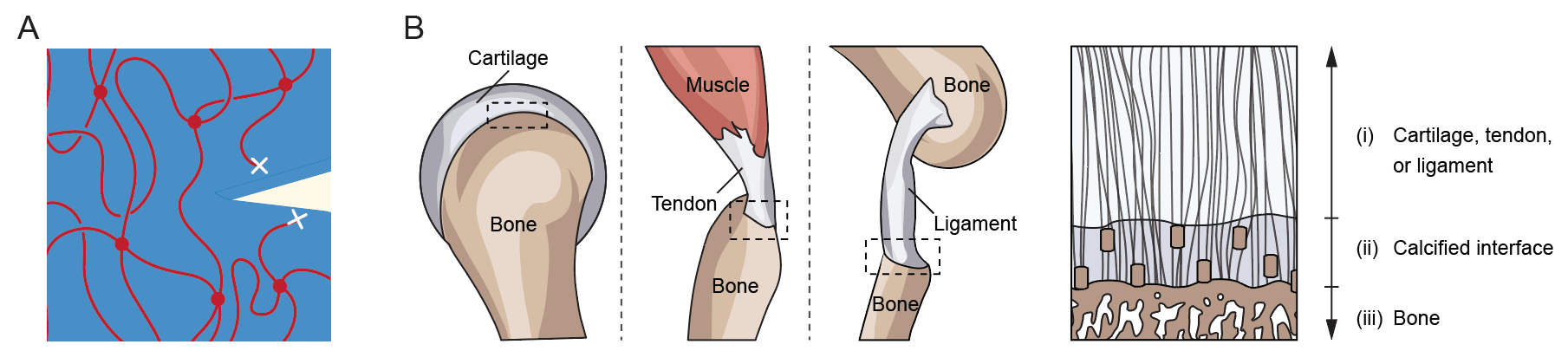 Figure 1. Fatigue threshold of A), conventional polymer networks for elastomers and hydrogels and B), biological hydrogels with intrinsically high-energy phases such as nanocrystalline domains and nanofibers.