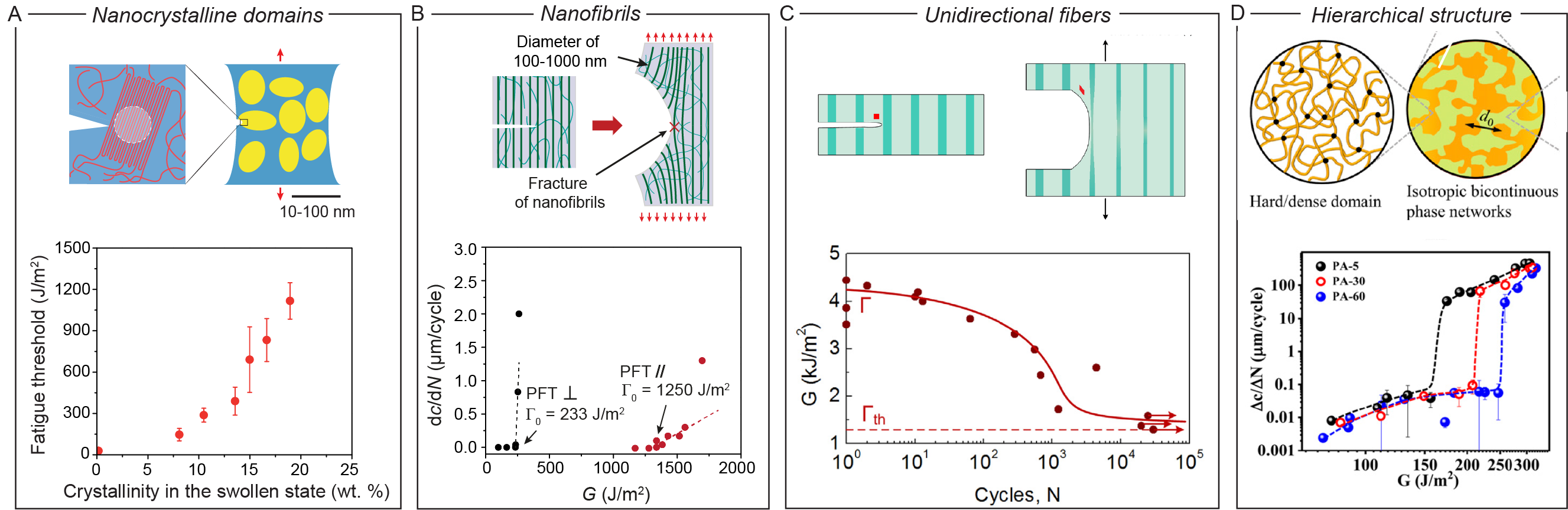 More recently, Wang and Suo et al. [22] reported a new principle to enhance elastomer’s fatigue resistance by introducing unidirectional fibers in the soft matrix (Fig. 2C). Both the fibers or the matrix have a low fatigue threshold. The combination of the fibers and the matrix shows a remarkable high fatigue threshold, because the soft matrix deconcentrates stress in the fiber. They demonstrate the strategy by embedding fibers of a polydimethylsiloxane (PDMS) elastomer into a matrix of a polyacrylamide (PAAm) hydrogel. No damage is observed when the composite is stretched for 30000 cycles with an amplitude of the energy release rate of 1290 J/m2. By harnessing the capability of 3D printing, Tang and Suo et al. further expanded the principle into two-dimensional elastomeric lattices, reaching the fatigue threshold beyond 500 J/m2 in multiple directions [24].