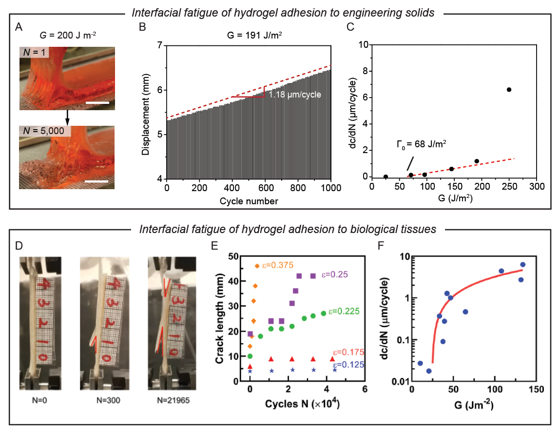 Similarly, Ni and Li et al. [27] observed the interfacial fatigue of hydrogel adhesions to biological tissues (Fig. 3D-E). They performed modified lap-shear tests with three types of loading (e.g., monotonic, static, and cyclic loads). They observed shakedown of the load-displacement curves during cycling and two interfacial fracture phenomena: fast debonding and interfacial fatigue fracture. They further confirmed the existence of a fatigue threshold (24.4 J/m2) for the tough hydrogel-tissue interface, below which the interface is immune against prolonged cyclic deformation.