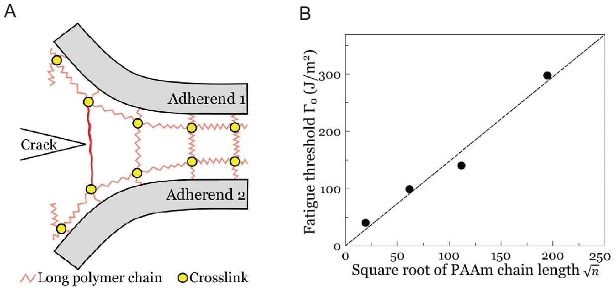 Lu and Suo et al. [28] reported a different approach for the design of fatigue-resistant hydrogel adhesion by using a particularly simple kind of elastic dissipater: long-chain polymers (Fig. 5A). As a proof of concept, they used polyacrylamide hydrogels to adhere two pieces of polyester cloth through topological entanglement. The measured fatigue threshold of the adhesion is linearly proportional to the square root of the chain length and reaches 300 J/m2 (Fig. 5B).