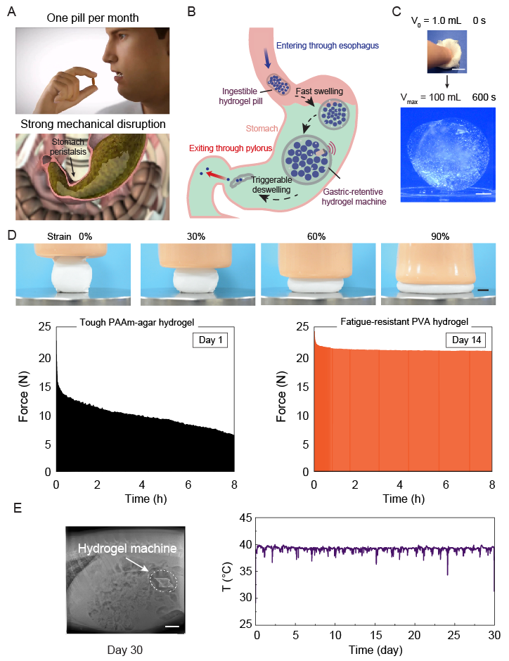 Devices that interact with living organisms are typically made of metals, silicon, ceramics, and plastics. Implantation of such devices for long-term monitoring or treatment generally requires invasive procedures. Hydrogels offer new opportunities for human-machine interactions due to their superior mechanical compliance and biocompatibility. Additionally, oral administration, coupled with gastric residency, serves as a non-invasive alternative to implantation (Fig. 6A). Achieving gastric residency with hydrogels requires the hydrogels to swell very rapidly and to withstand gastric mechanical forces over time (Fig. 6B). However, high swelling ratio, high swelling speed, and long-term robustness do not coexist in existing hydrogels.