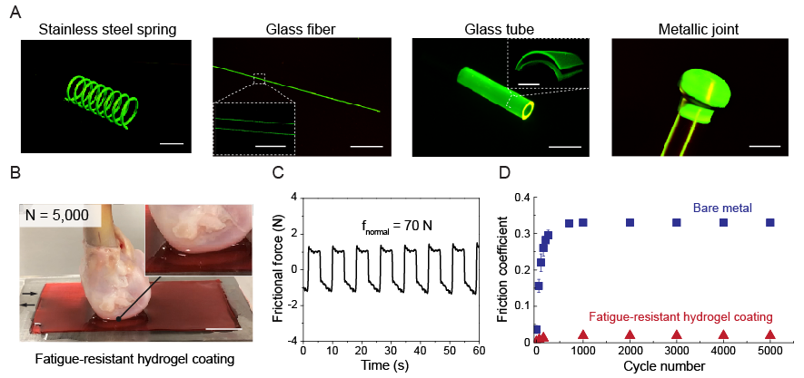 Materials and devices with complex shapes can be exposed to repeated mechanical loads, which pose a challenge to their coating materials in terms of fabrication method and long-term robustness. We demonstrate that the fatigue-resistant hydrogel adhesion can potentially provide a facile and versatile solution towards this challenge. We first present a set of materials and devices, including a stainless-steel spring, a glass optical fiber, a glass tube, and a ball-and-socket metallic joint, which are coated with a fatigue-resistant hydrogel coating layer (Fig. 7A). The thin (~20 μm in thickness) and uniform hydrogel coatings are applicable to devices with various feature sizes (from 200 μm to 35 mm), curvatures (convex surface, concave surface, and inner and outer surfaces), and diverse materials (glass, stainless steel, and silicone elastomer). We further adopt the ball-on-flat sliding test to evaluate the adhesion, friction, and wear performances of our fatigue-resistant hydrogel coating on a stainless-steel surface over cyclic mechanical loading (Fig. 7B-C). The fatigue-resistant hydrogel coating remains mechanically robust and adheres on the substrate over 5000 cycles of reciprocating motion (Video 2). As shown in Fig. 7D, the friction coefficient of the fatigue-resistant hydrogel coating increases from 0.006 to 0.02 and maintains around 0.02 until the end of the test (5000 cycles). In comparison, the friction coefficient of the bare metal surface increases from 0.045 to as high as 0.3 as the cycle number increases from 1 to 300 (under a compression force of 100 N), and remain constant afterwards.