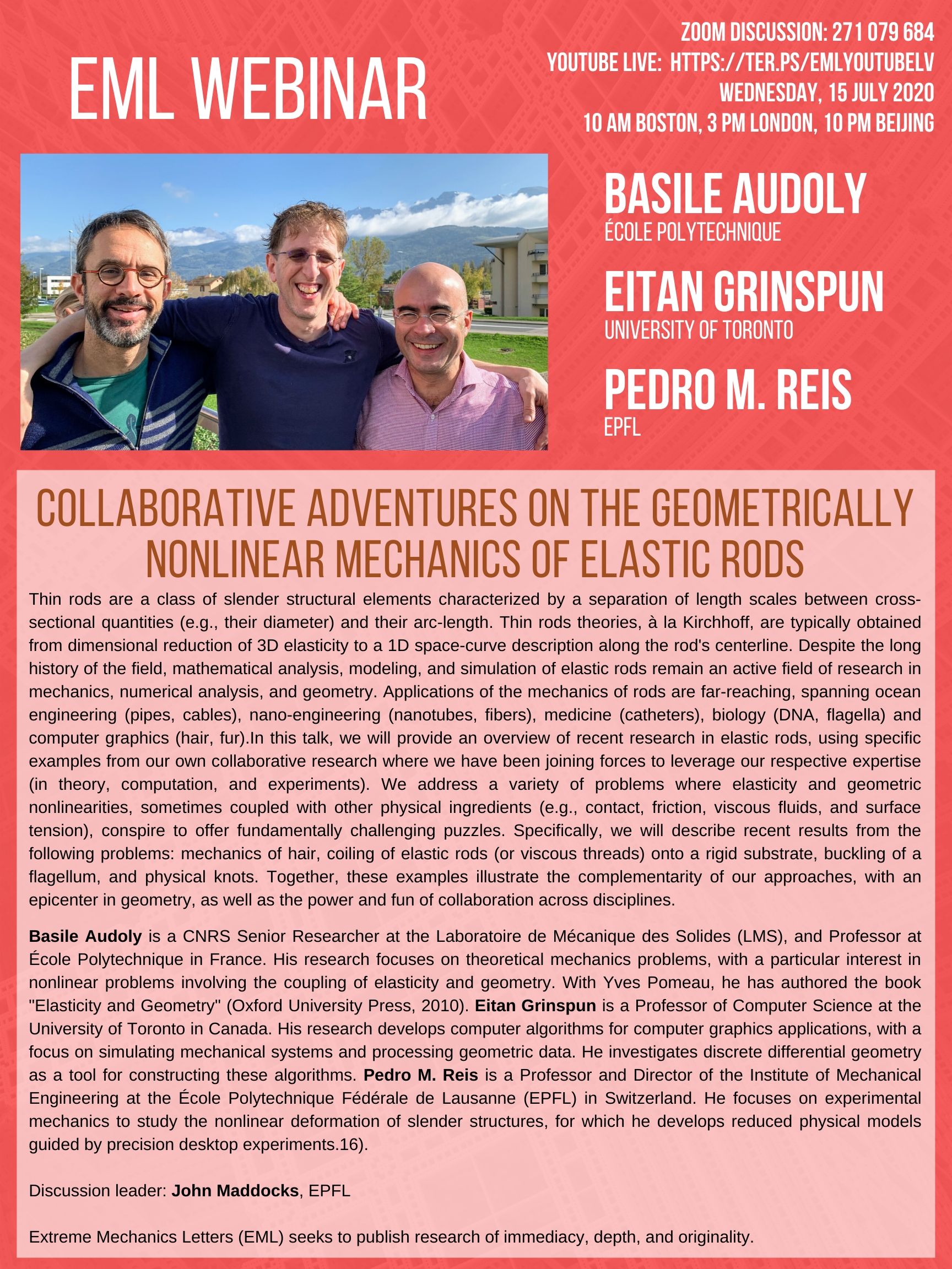EML Webinar on July 15, 2020 will be given by Professors Basile Audoly (École Polytechnique) / Eitan Grinspun (University of Toronto) / Pedro M. Reis (EPFL) via Zoom meeting. Discussion leader: Professor John Maddocks, EPFL