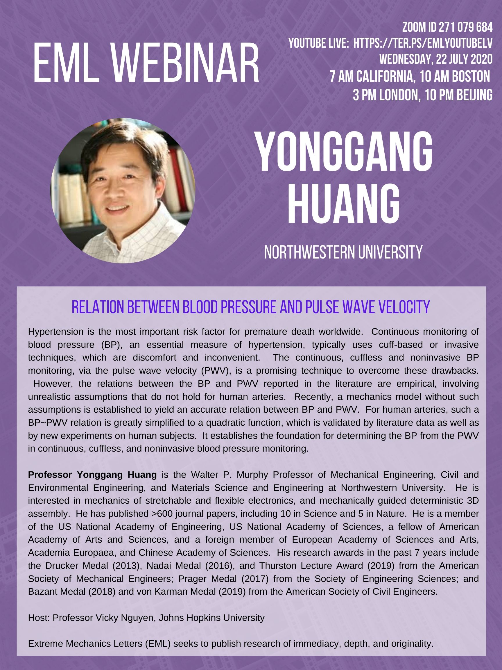 EML Webinar on July 22, 2020 will be given by Professor Yonggang Huang, Northwestern University via Zoom meeting. Discussion leader: Vicky Nguyen, Johns Hopkins University.