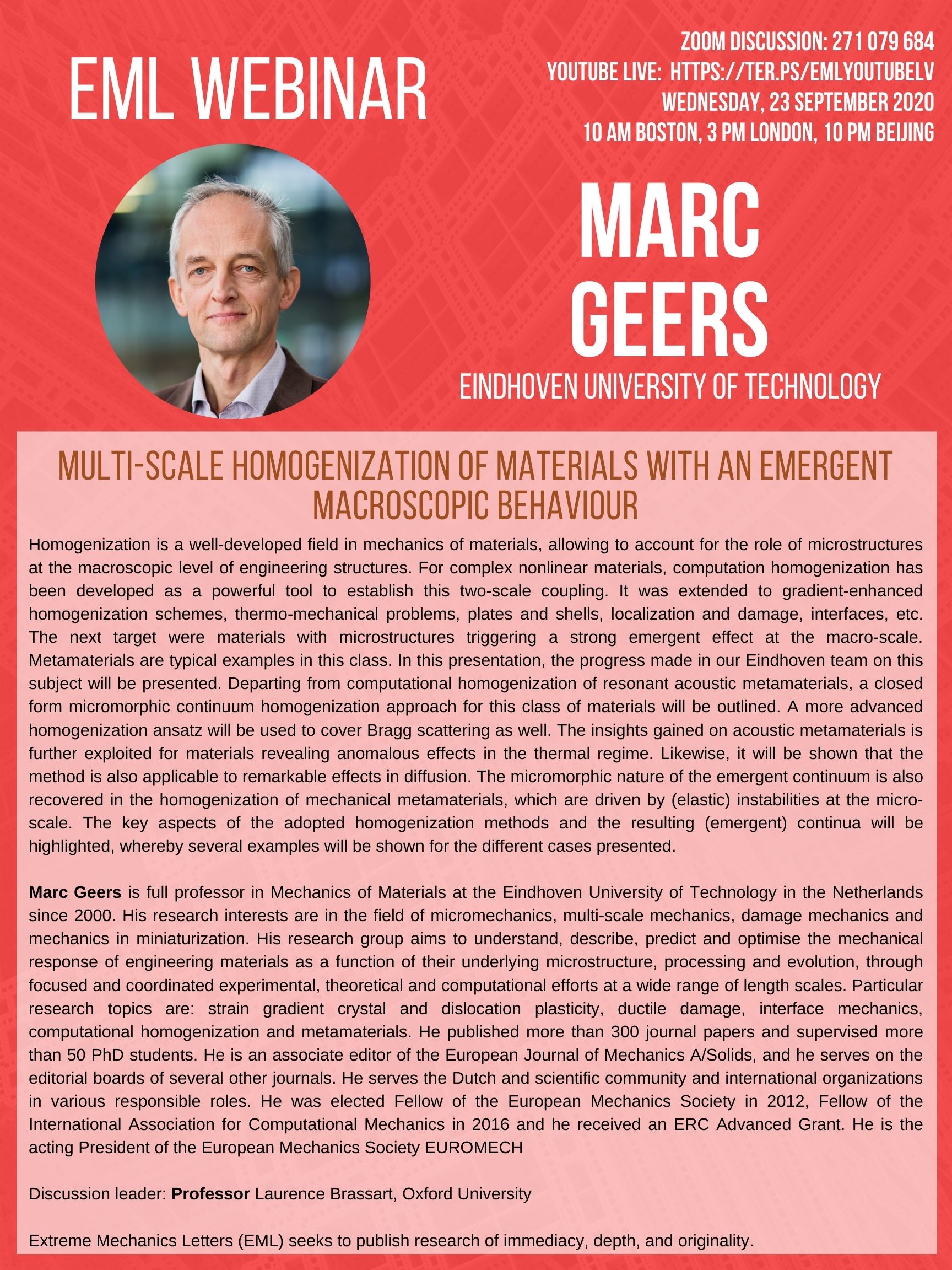EML Webinar on 23 September 2020 will be given by Marc Geers, Eindhoven University of Technology, Discussion leader: Laurence Brassart, Oxford University.