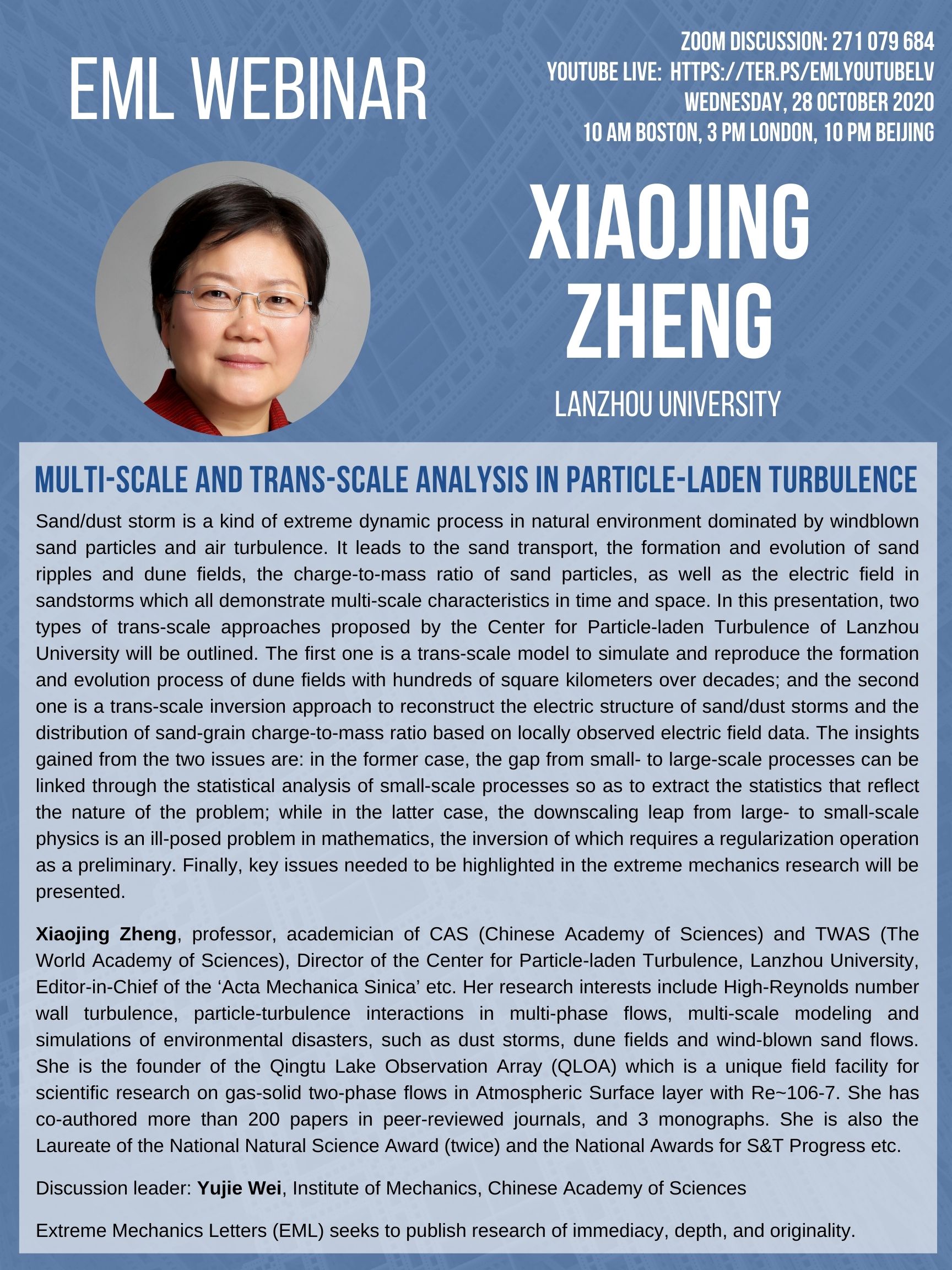 EML Webinar on 28 October 2020 will be given by Prof. Xiaojing Zheng, Lanzhou University. Discussion leader: Prof. Yujie Wei, Institute of Mechanics, Chinese Academy of Sciences.