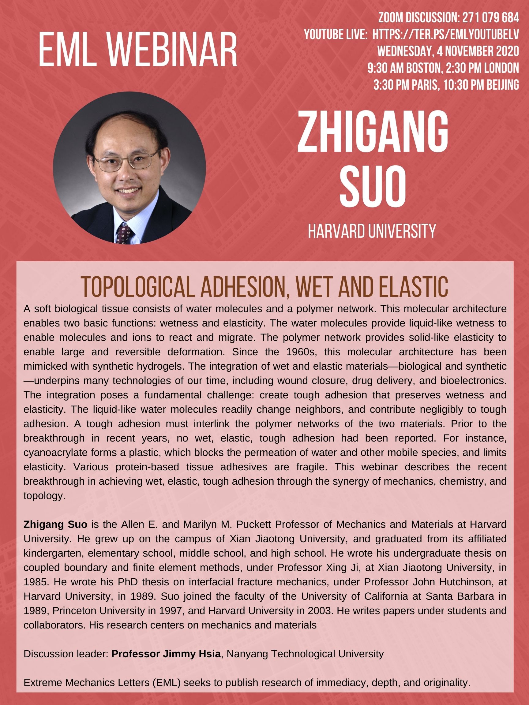 EML Webinar on 4 November 2020 will be given by Zhigang Suo, Harvard University. Discussion leader: Jimmy Hsia, Nanyang Technological University