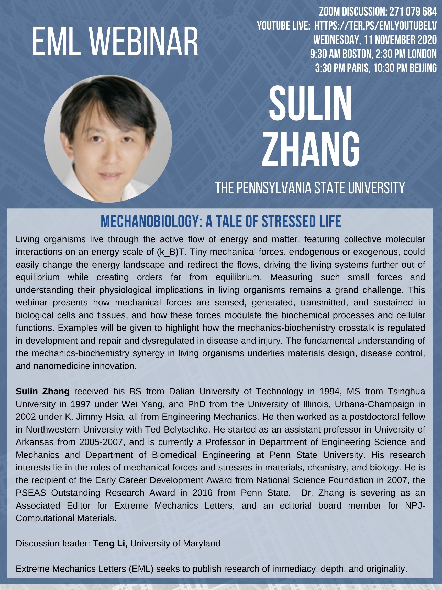 EML Webinar on 11 November 2020 will be given by Sulin Zhang, Penn State University. Discussion leader: Teng Li, University of Maryland