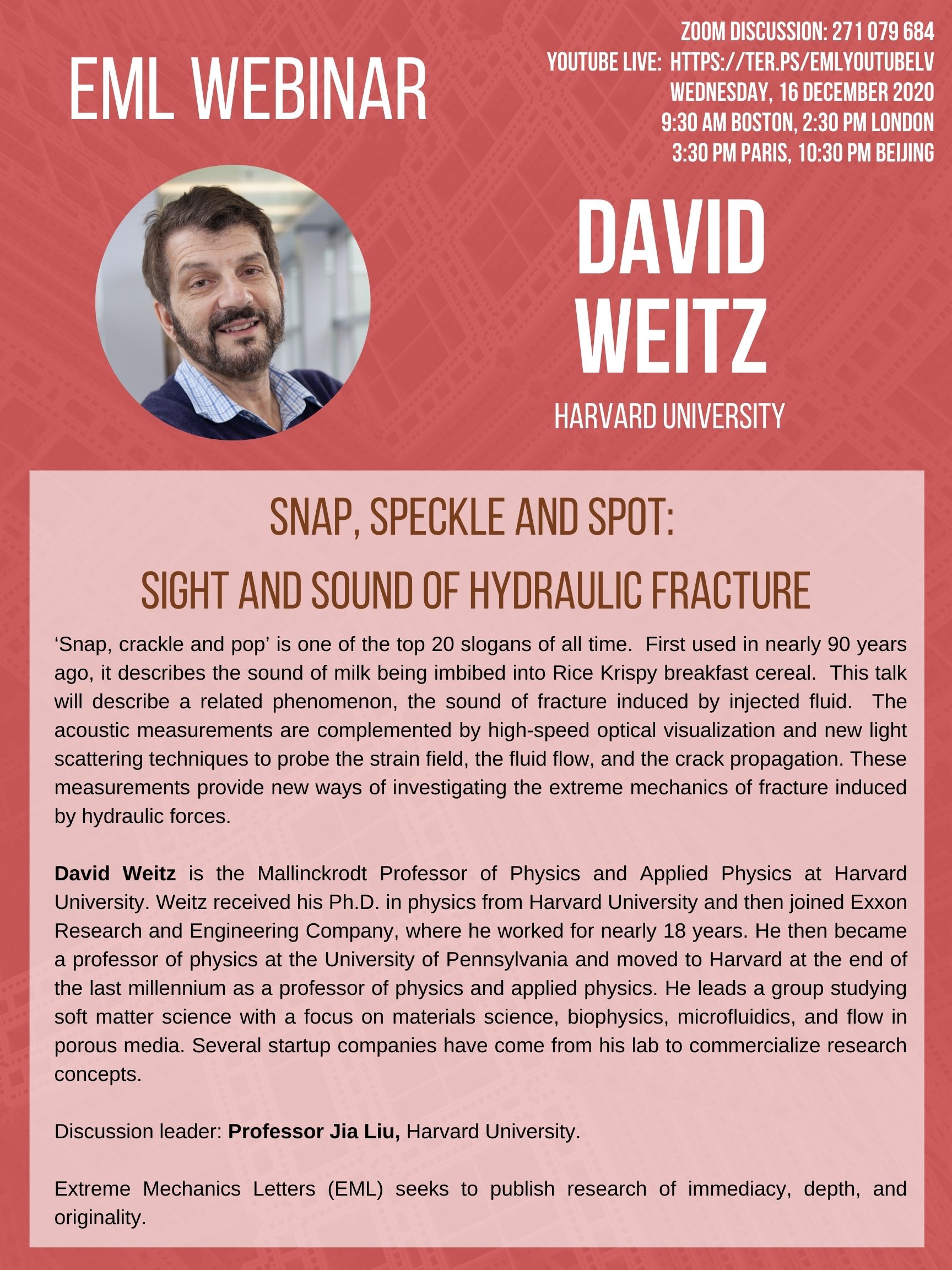 EML Webinar on 16 December 2020 will be given by Dave Weitz, Harvard University. Discussion Leader Jia Liu, Harvard University.