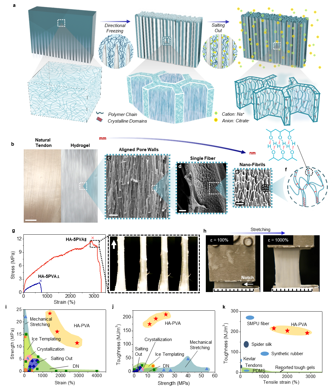- The HA-5PVA hydrogel showed a remarkable gradual failure mode featuring stepwise fracture and pull-out of fibers typical for highly anisotropic materials like tendons (Fig. 1g).