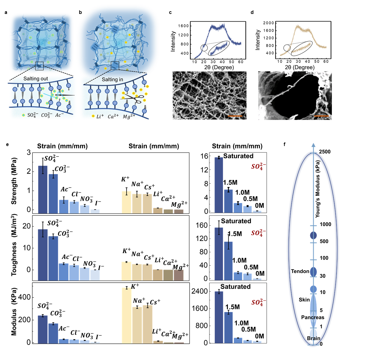 - The specific ion effect is usually concentration sensitive. Here, Na2SO4 was used as an example to study the influence of concentrations. As concentration of Na2SO4 increased from 0.5 M to saturated (~1.8 M at room temperature), the ultimate stress and maximum strain of the resulted hydrogel increased significantly from 1.0 MPa to 15.0 MPa and from 1500% to 2100%, respectively (Fig. 2e).