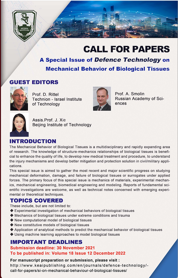 Submitted by D.Rittel on Thu, 06/10/2021 - 10:39 Prospective authors are welcome to submit! http://www.keaipublishing.com/en/journals/defence-technology/call-for-papers/si-on-mechanical-behaviour-of-biological-tissues/ Attachment Size Screen Shot 2021-06-10 at 13.38.59.png 776.92 KB Log in or register to post comments1333 views