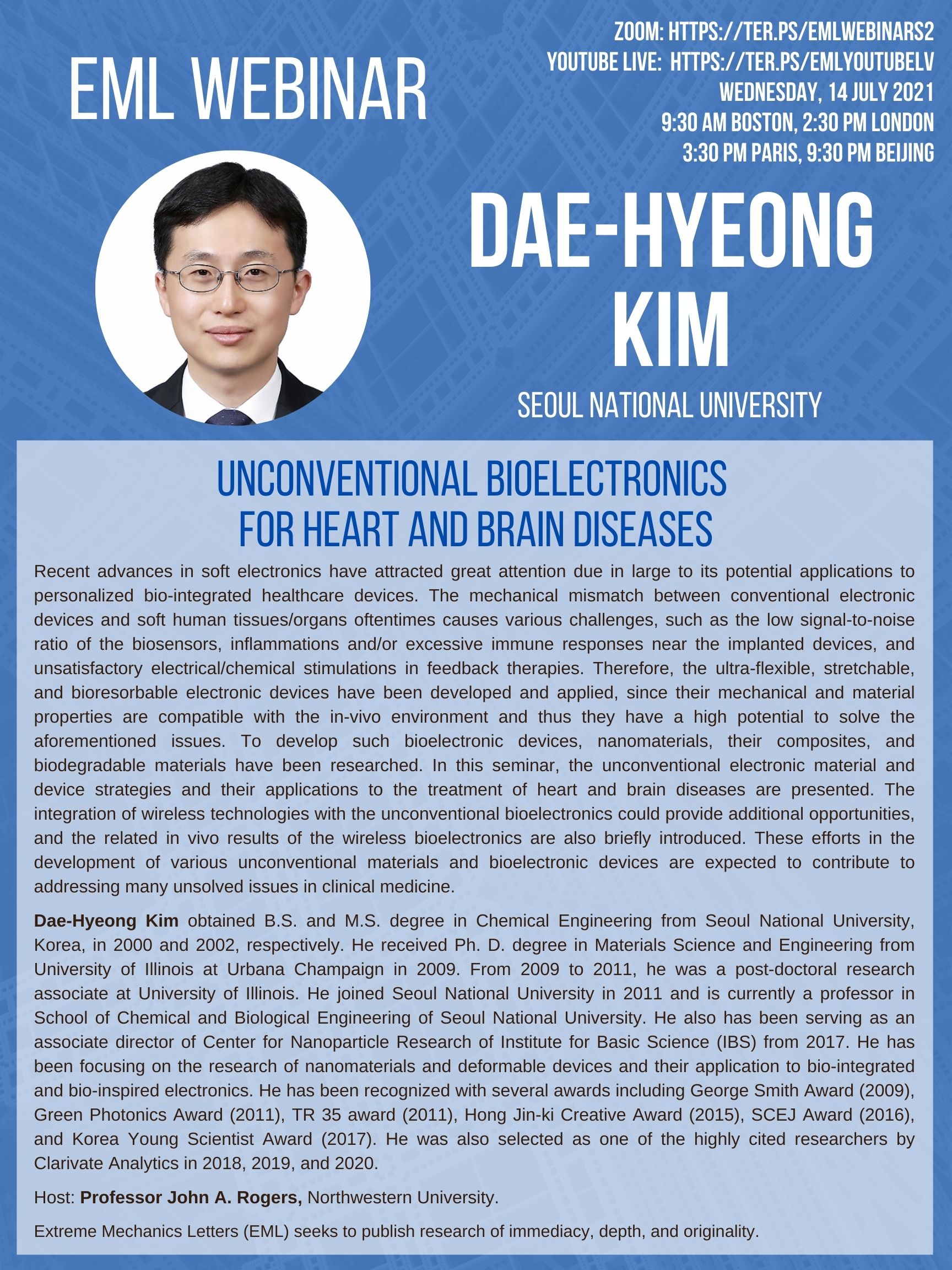 EML Webinar (Season 2) on 16 July 2021 will be given by Dae-Hyeong Kim on Unconventional Bioelectronoics for Heart and Brain Diseases. Host: John A. Rogers, Northwestern University