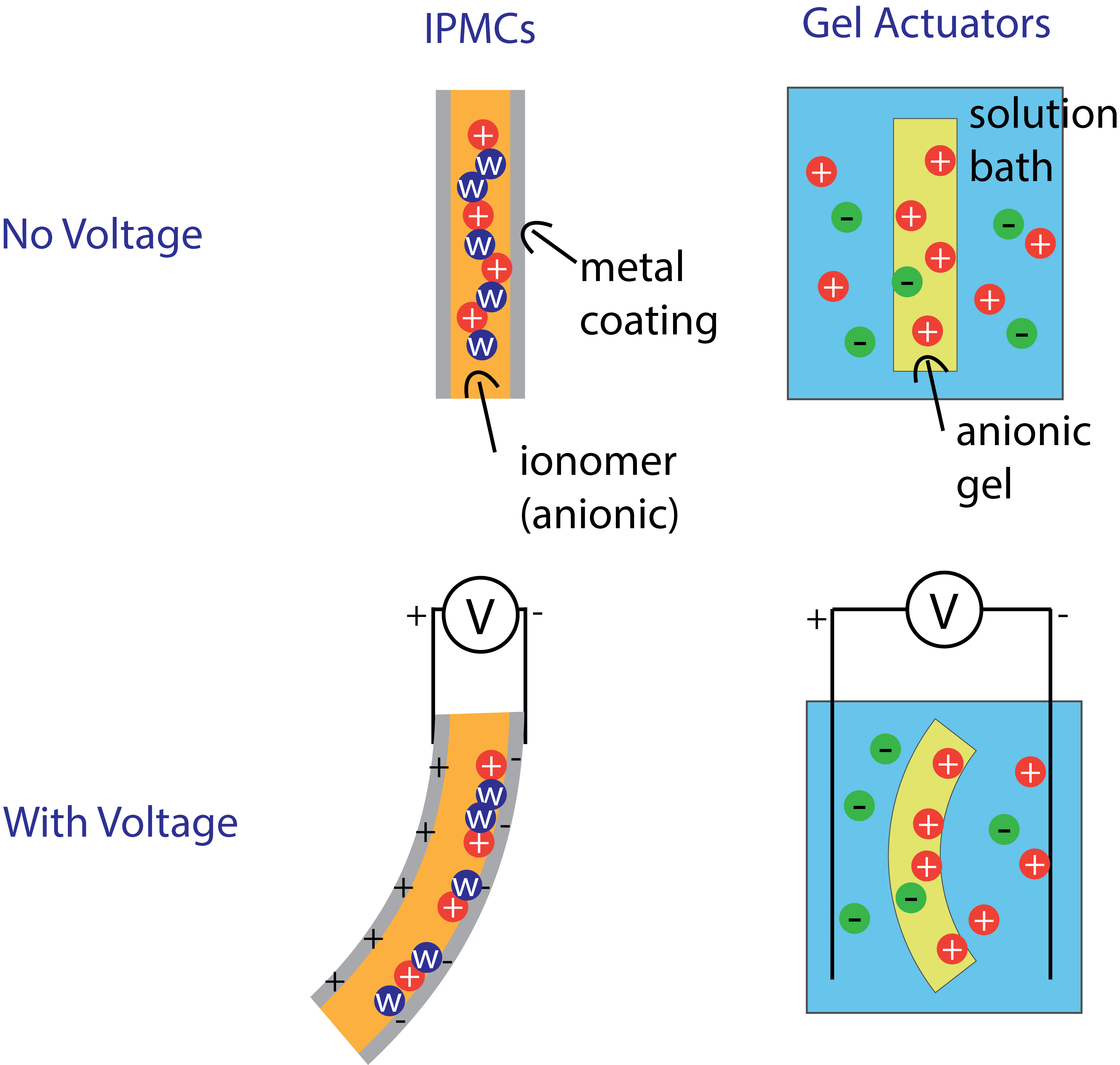 Figure 1. Schematics of ionic polymer metal composite actuators (left) and in electrolyte gel polyelectrolyte bending actuators (right). Only mobile ions are shown.
