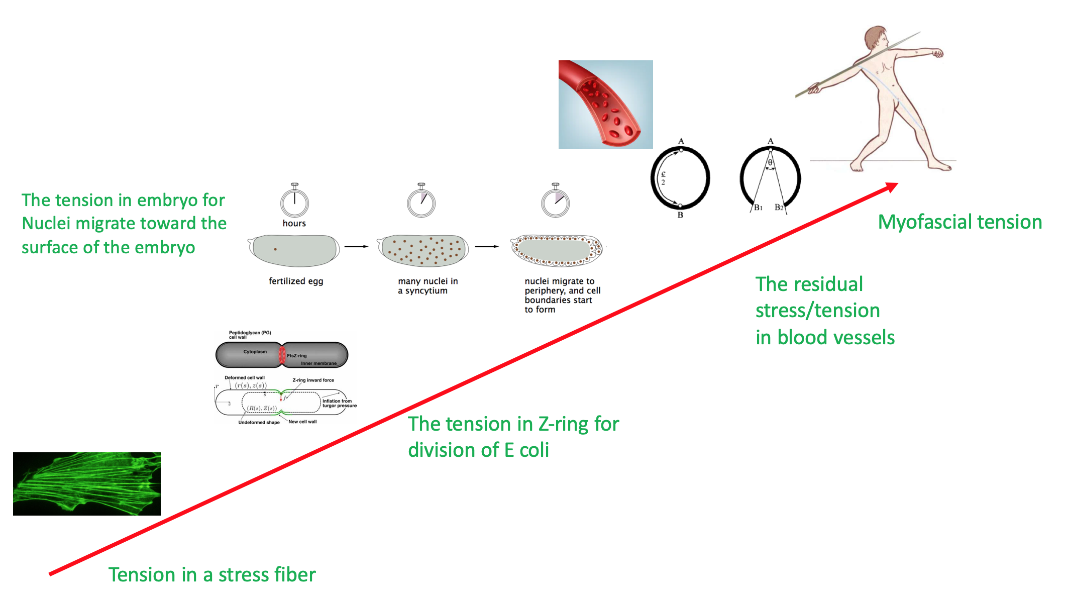 The tension universally presents in the living organisms of different scales. At the cellular and sub-cellular scales, a typical example is the tension force in the actin cytoskeleton that is produced by acto-myosin-II, which plays crucial roles in cell mechanosensing behaviors [4]. A similar structure is found in the Z-ring [5] that forms during the division of E coli that produces a large tension force dividing the cell into two separate parts (Figure 1). The intra-cellular tension force can also be produced by the microtubules for cell mitosis [6].