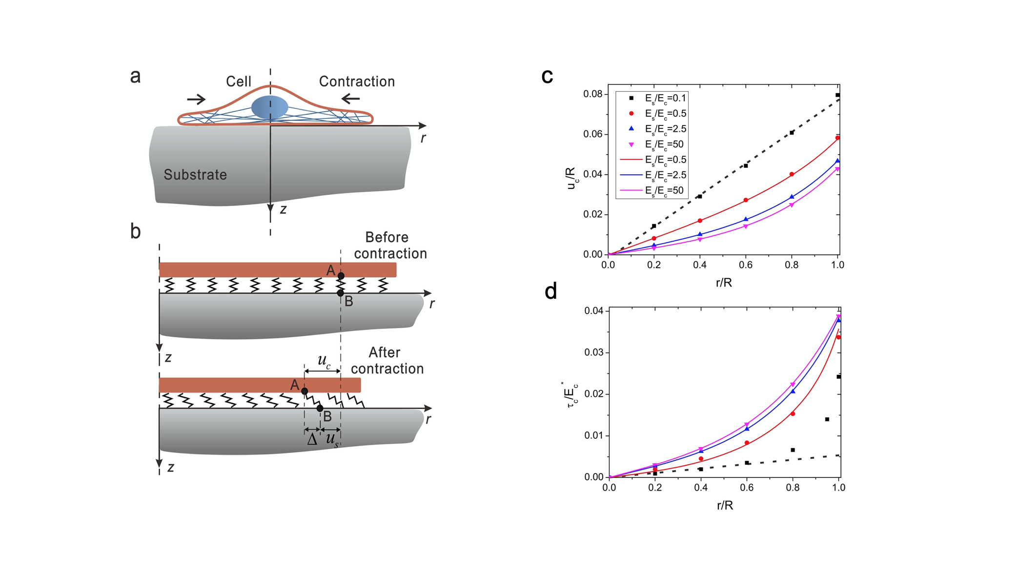 Figure 2. The contracting-disk model of cell–matrix interaction. (a) Schematic of a cell adhering to and pulling on an elastic substrate, owing to the intrinsic contractility of the cell. (b) The cell is modeled as an elastic contracting disk that is anchored to the substrate via molecular bonds. (c) The cell displacement increases with distance from the cell center. (d) The traction increases with distance from the cell center [24].