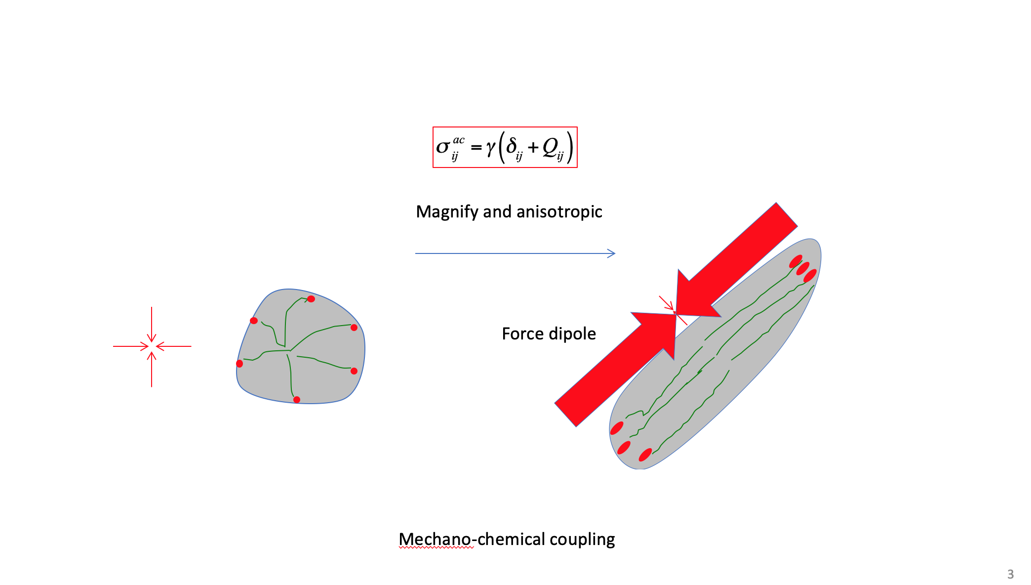 According to Figure 3, the typical structural features of cell polarity are areal and geometric change of cell (an increase of area and aspect ratio), and the associated polymerization and re-arrangement of cytoskeleton, as well as the areal and geometric change of focal adhesion (an increase of area and aspect ratio). According to the traction-distance law, the tension force by cytoskeleton along the long axis of the cell should be larger than that along the short axis of the cell. That is, not only the structure, but also the tension force and its distribution are changed. This is a new understanding of cell polarization from the point of view of physics/ mechanics. The mechanical character of cell polarization can be expressed by a tensor, called cell active stress, σ_ij^ac=γ(δ_ij+Q_ij), where Q_ij is the nematic order parameter, which describes the anisotropy of the active stress due to the polarity of cell [25].