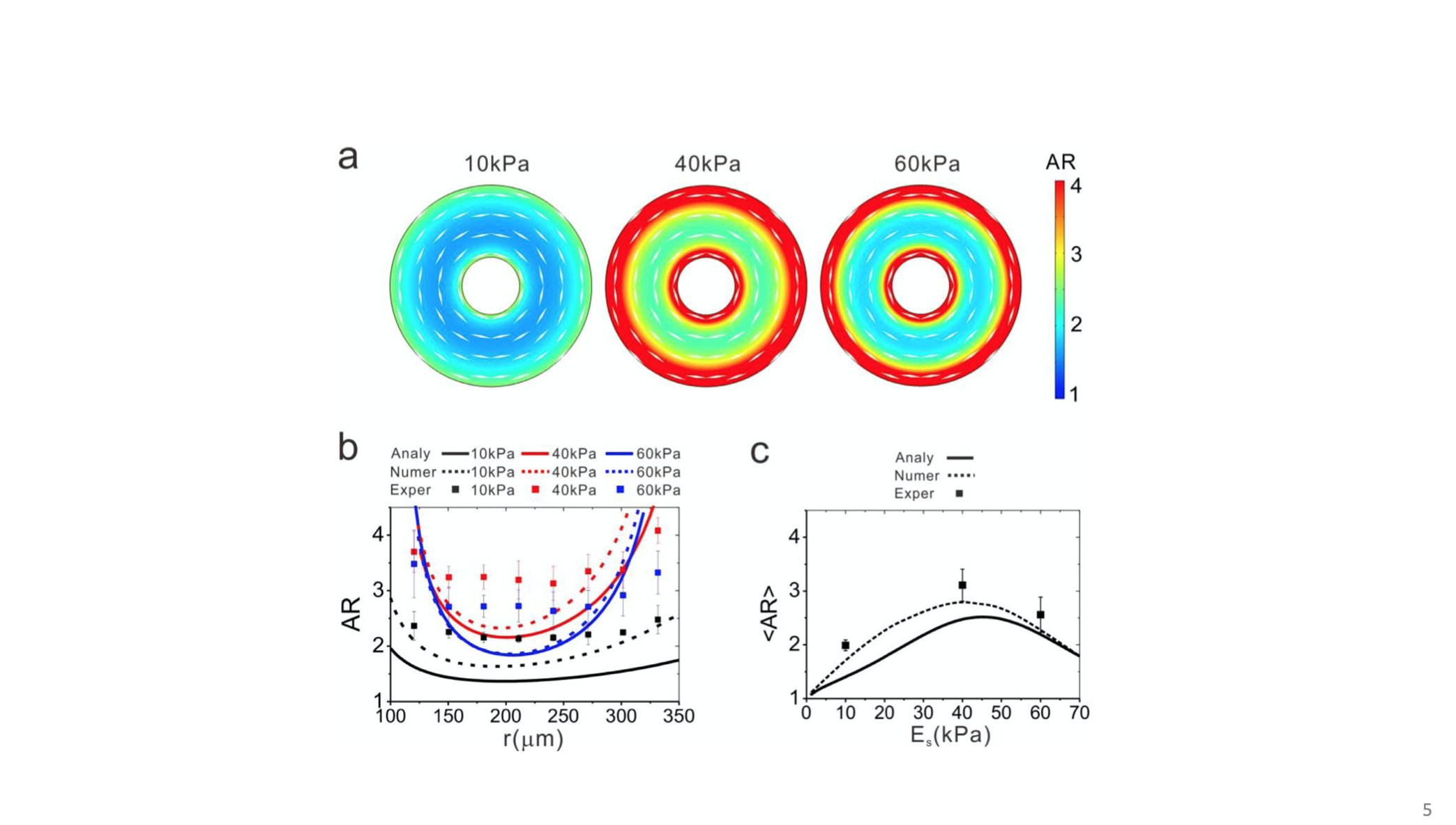 Figure 5. Cell polarization and alignment on a ring pattern of different substrate stiffness. (a) The model prediction. The color map illustrates the cell aspect ratio (AR) and the white spindles indicate the cell orientation. (b) Cell AR as function of the radial coordinate for different substrate stiffness. (c) The mean value of cell aspect ratio biphasically depends on the substrate stiffness [25].