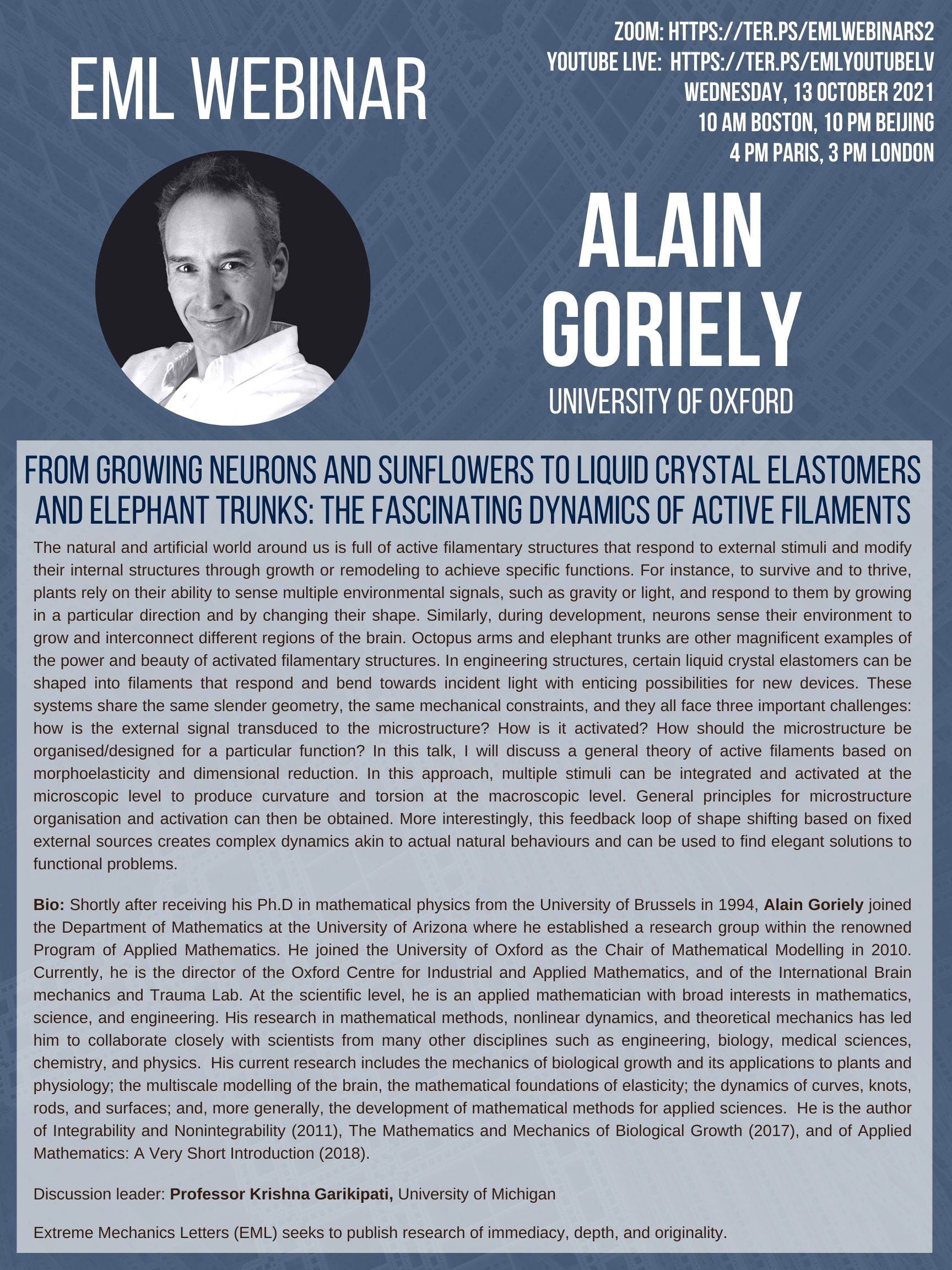 EML Webinar (Season 2) on 13 October 2021 will be given by Alain Goriely on dynamics of active filaments. Discussion leader:Krishna Garikipati, University of Michigan