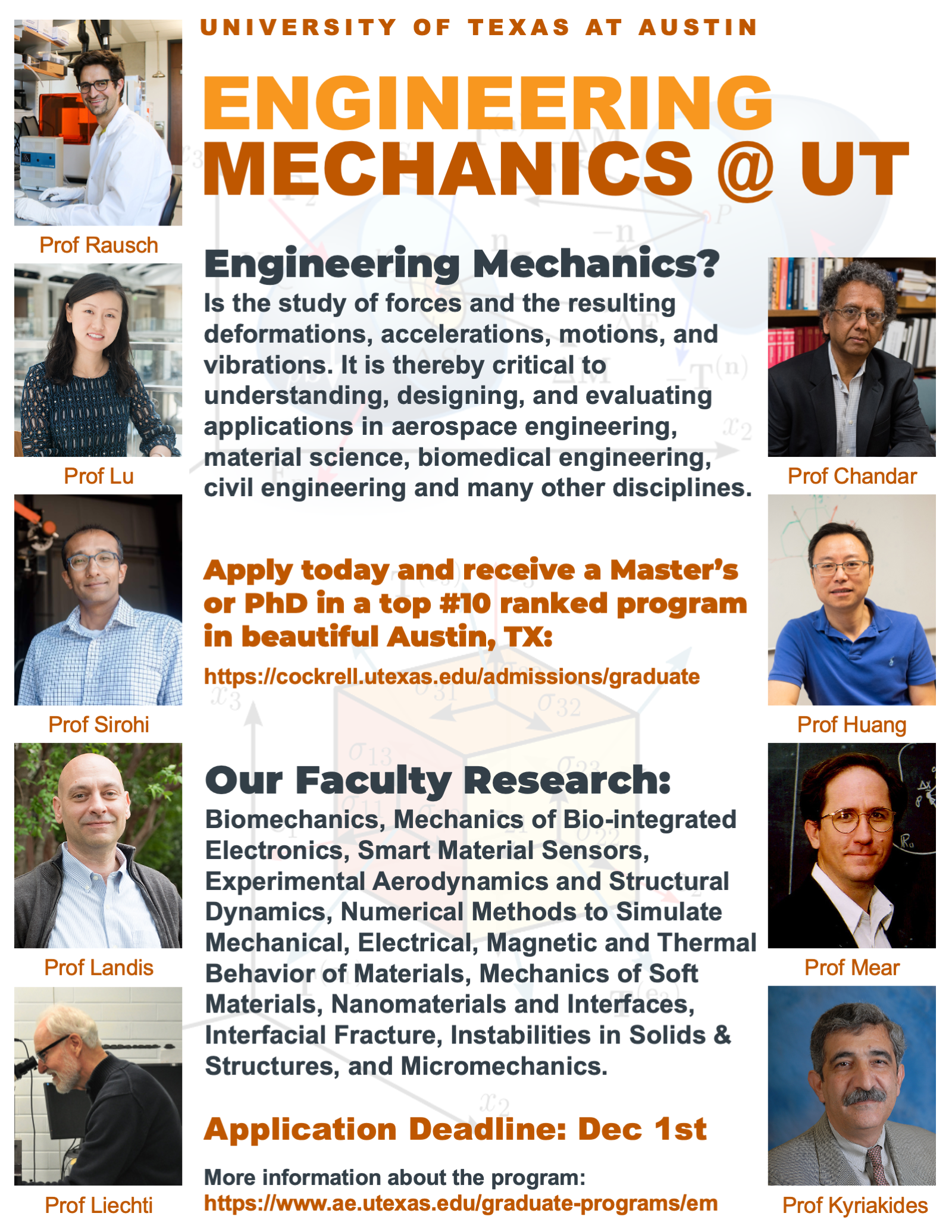 UT-Austin Engineering Mechanics Program is well known for its research on experimental mechanics, computational mechanics, fracture mechanics, nano- and micro-mechanics, thin-film mechanics, biomechanics, soft material mechanics, structural dynamics, and so on. We are the home of the International Journal of Solids and Structures (IJSS), International Journal of Fracture, and Computer Methods in Applied Mechanics and Engineering. We offer more than 20 rigorous graduate courses on engineering mechanics. Our graduates are well placed in academia, industry, and government. We welcome Ph.D. and M.S. applications for Fall 2022. The deadline to apply is Dec. 1st, 2021: https://www.cockrell.utexas.edu/admissions/graduate.
