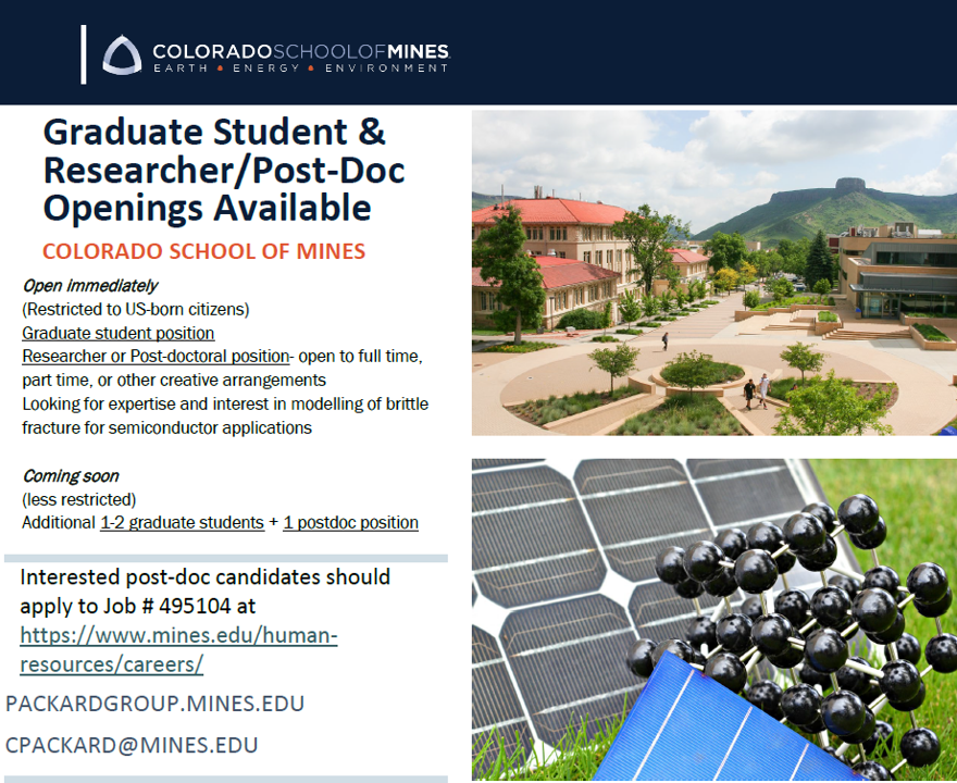 Please share this opportunity with anyone who might be interested and contact me by email if you'd like more information. (cpackard [at] mines.edu). The senior position(s) can be filled either at the post-doctoral researcher or research faculty (soft money) level. The post-doctoral/research faculty posting lists a salary range- in addition to salary compensation, the position comes with a fully paid (no out of pocket premiums!) health insurance plan for individual or family(!!) insurance. Research faculty positions do not require a PhD if there is suitable industrial or work experience.