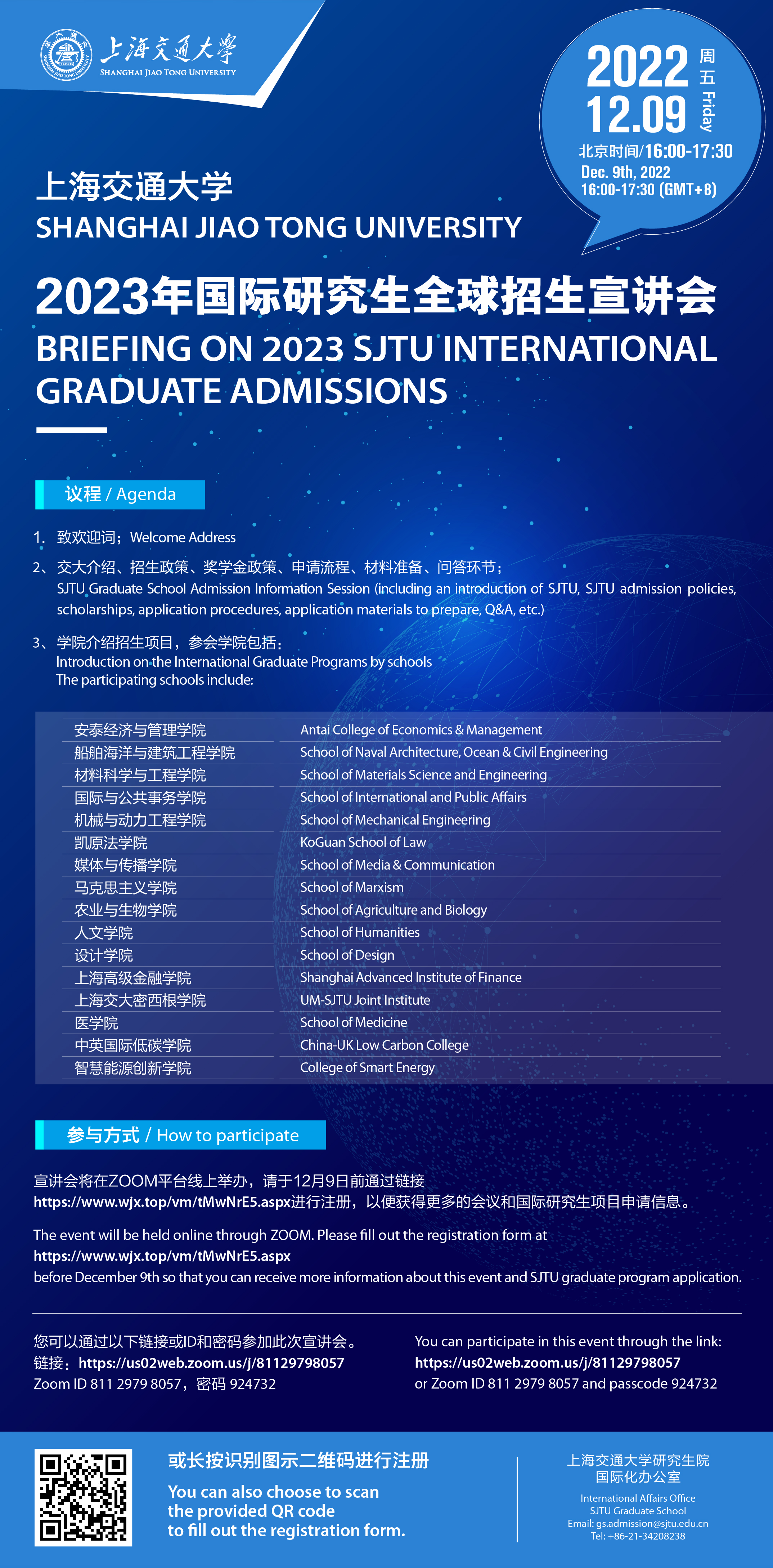 Shanghai Jiao Tong University (SJTU) will hold an online information session on “Briefing on 2023 International Graduate Admissions - Masters and Ph.D. programs” on Friday, Dec 9th. In addition, the UM-SJTU Joint Institute (JI) will organize a specific info session following the SJTU opening introduction. Please see the attached flyers for more information.