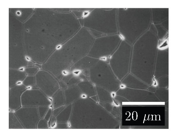 Figure 2. Scanning electron micrograph of a sintered alumina specimen [13]. In this class of material systems, pores at grain boundaries (showing as bright spots in the image) are a common type of defect.