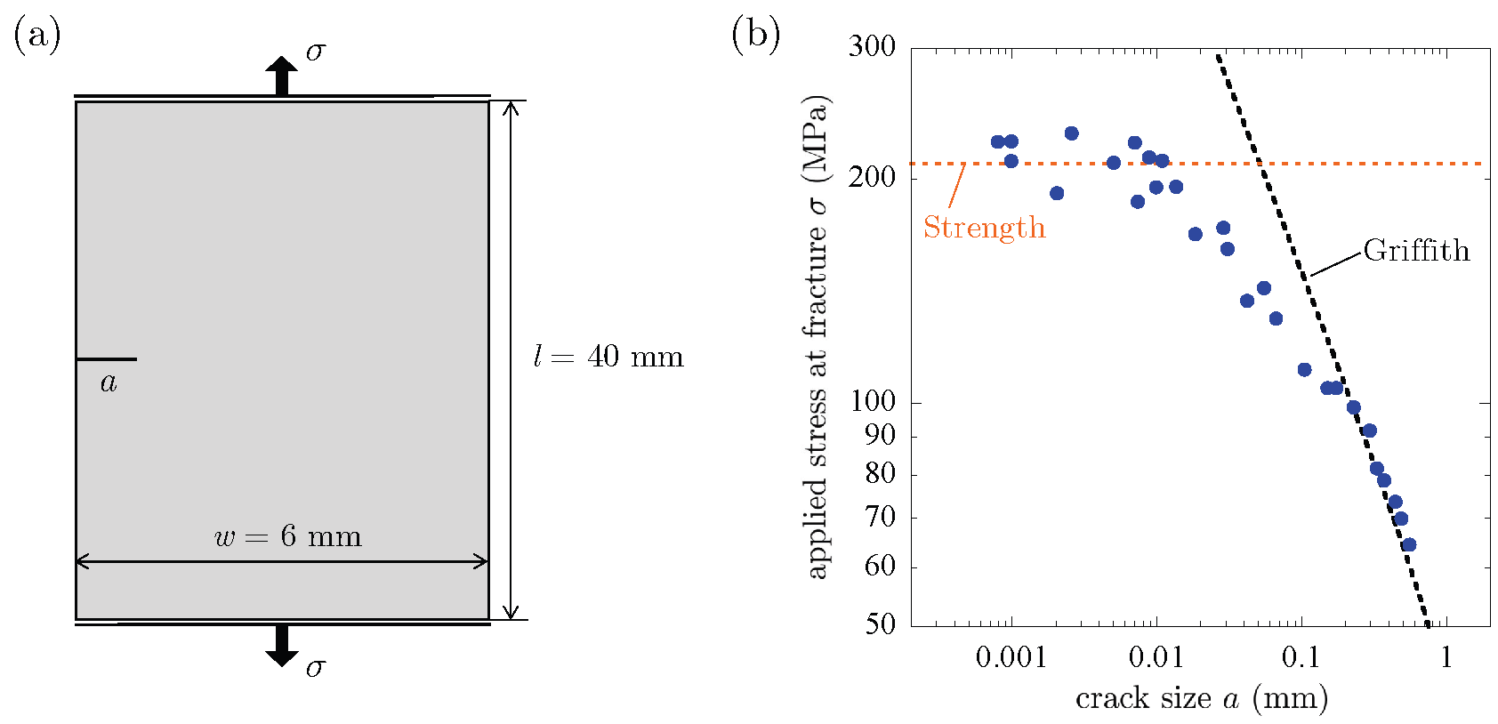 Figure 3. The experiments of Kimoto et al. [15] on alumina illustrating the transition from strength-dominated to Griffith-dominated nucleation of fracture as the size of the crack increases from = 0.80 μm to = 0.55 mm. (a) Schematic of the geometry of the specimens (thickness 5 mm) and applied boundary conditions. (b) Plot of the experimentally measured critical stress σ at which fracture nucleates from the crack as a function of its size . For direct comparison, the plot includes the predictions of nucleation based on strength (orange dotted line) and based on the Griffith competition between the elastic and fracture energies (black dashed line).