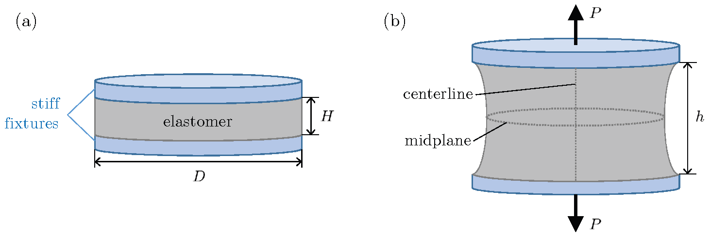Figure 4. Schematic of the poker-chip experiment in (a) the undeformed configuration and in (b) a deformed configuration at an applied deformation and corresponding tensile force . The diameter-to-thickness ratio of the elastomer disk, which is firmly bonded to the stiff fixtures, is typically chosen to be in the range ∈[2,50].