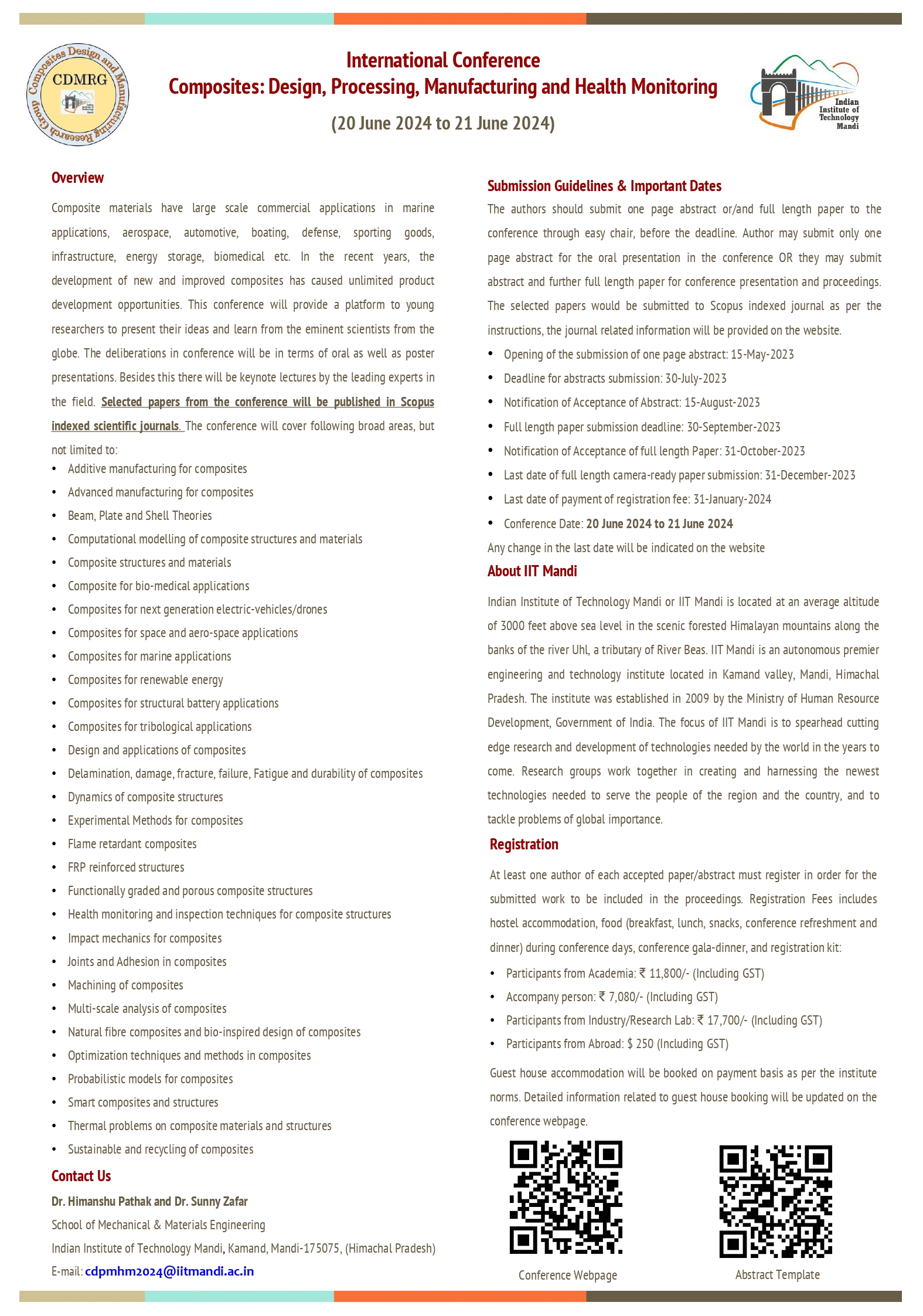 International Conference on Composites: Design, Processing, Manufacturing and Health Monitoring (CDPMHM 2024), will be organized at IIT Mandi (Himachal Pradesh, India) during 20-21 June 2024.