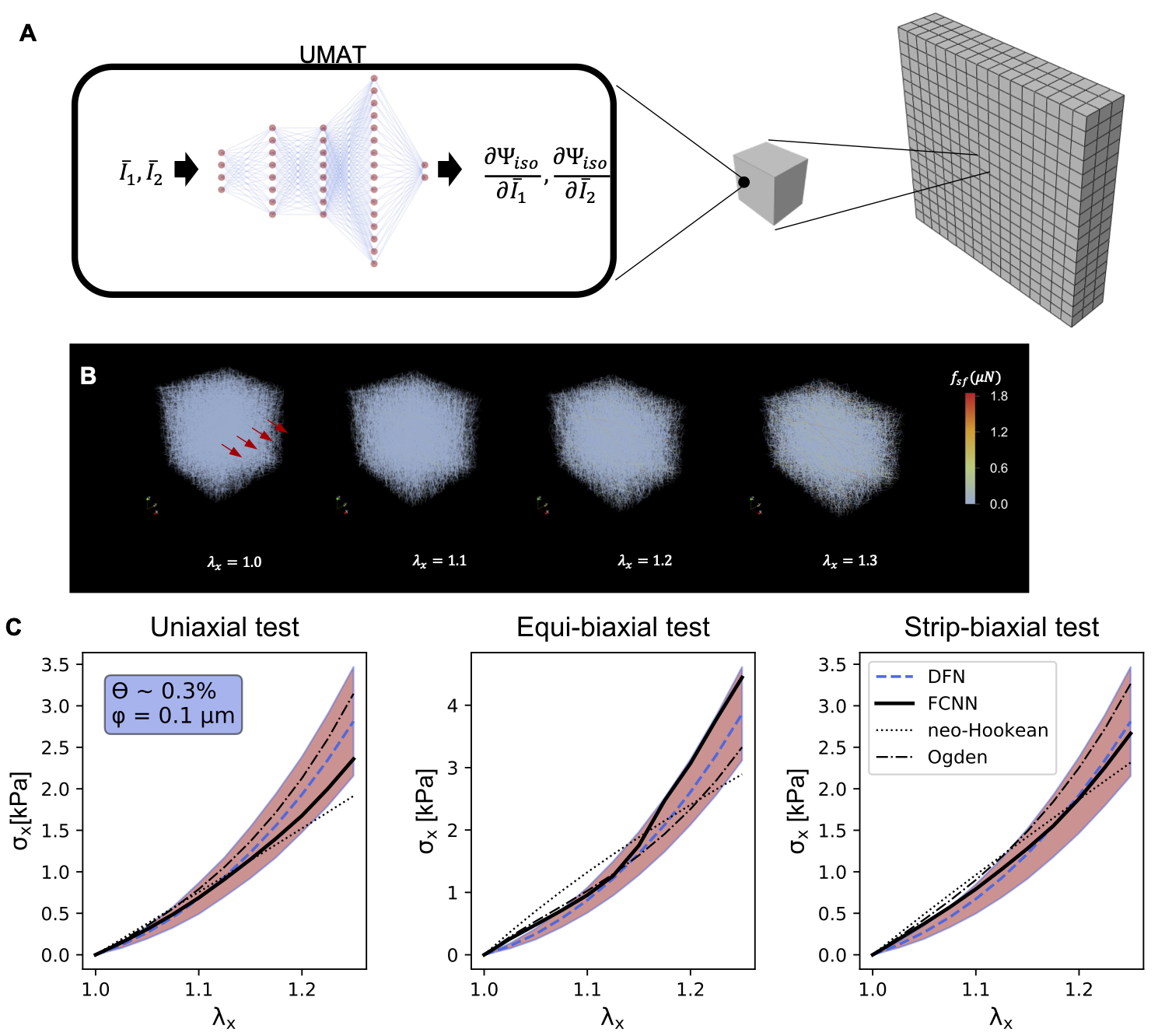 Fig 1. ML can be used to directly homogenize the response from detailed microstructure models (A). For example, we have developed different fully connected neural network approaches to learn the response of discrete fiber network models (B), under arbitrary deformations and across microstructures defined in terms of fiber diameters and volume fractions. The homogenized response predicted with the ML method outperforms analytical models and works over a range of microstructures (C) [11].