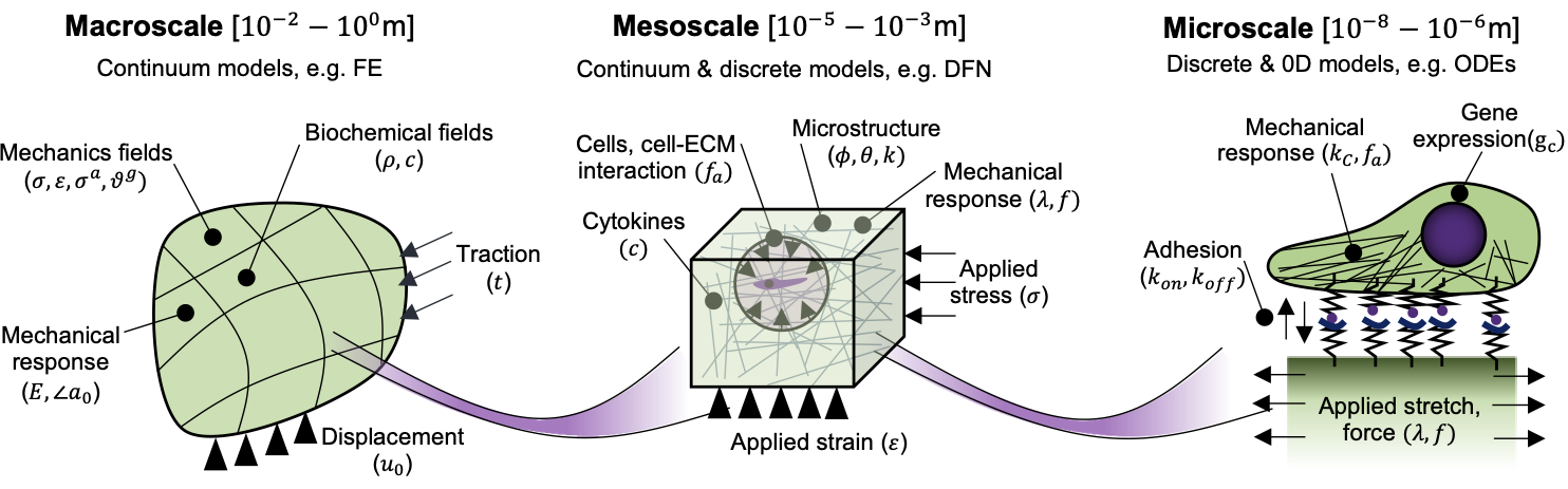 Fig 5. Modeling of  tissue growth and remodeling requires integration across spatial scales, from the cell adhesion modeling and corresponding gene expression, to the mesoscale fiber networks, to the tissue level mechanics [57].
