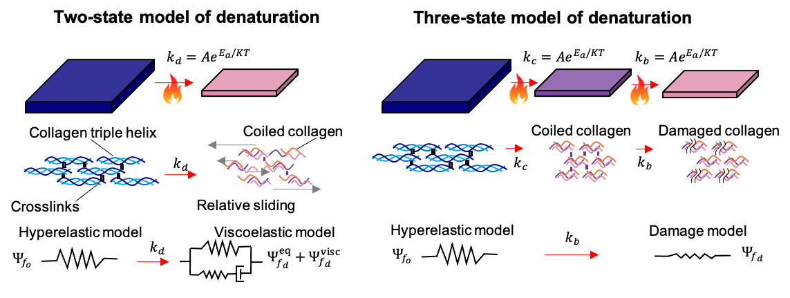 Fig 4. Damage due to heat can be modeled with the different microstructure-based models reviewed here [38, 39, 43, 44]. Namely, reaction rates for crosslinks and other, weaker, inter- and intra- collagen fiber interactions, coupled to damage models or viscoelasticity models based on fiber sliding, and stress-free lengths of intact and denatured collagen can combine to capture thermomechanics damage. However, new experiments and detailed multiscale simulations from the molecular scale up to the tissue are needed [41, 45].