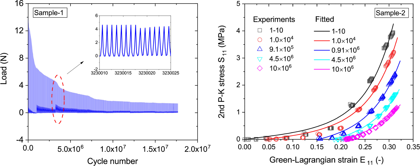 Fig 3. Typical damage accumulation in soft tissue. Subjected to displacement-driven deformation, load will decrease over millions of cycles of loading. The resulting stress-strain response shows the damage degradation for samples tested after different amount of fatigue. Taken with permission from [37].