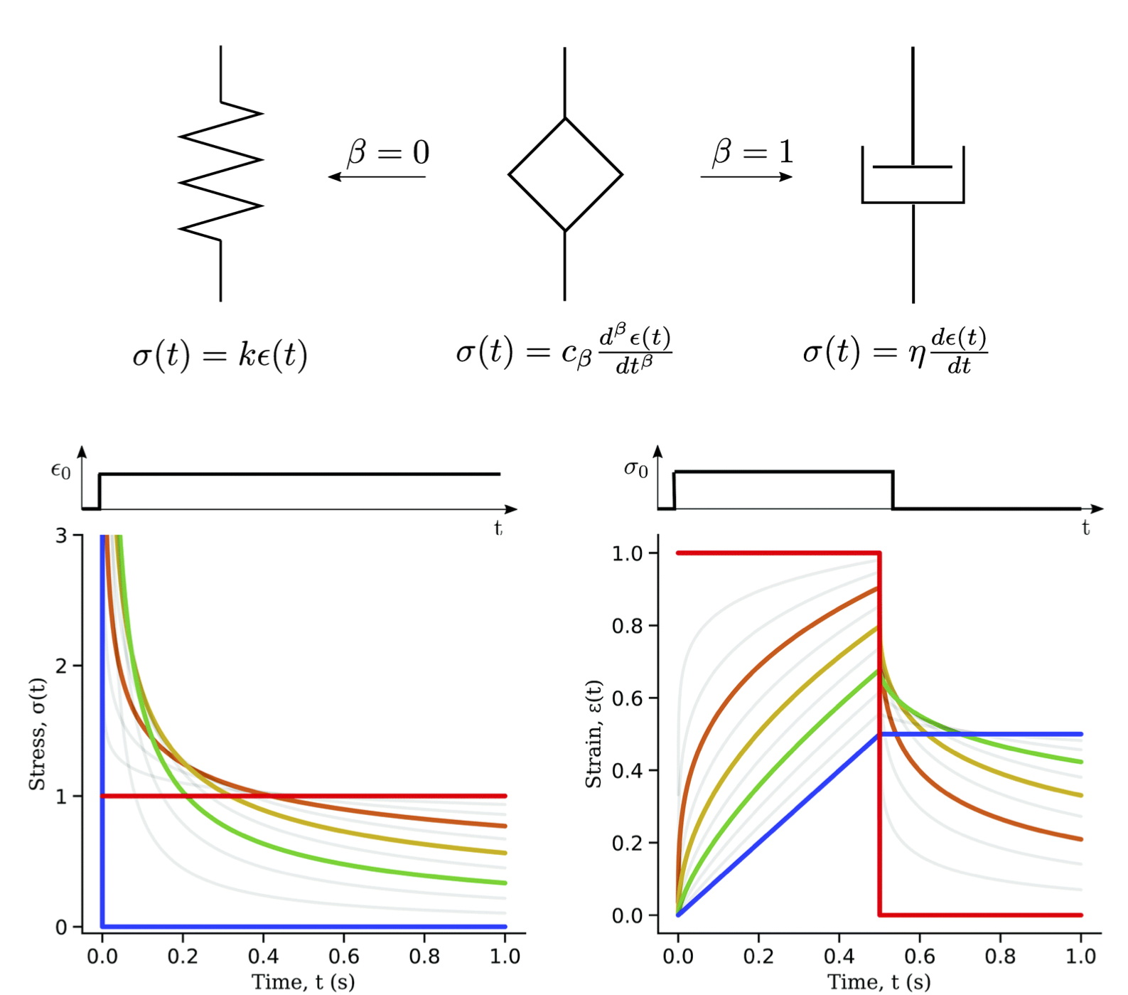 Fig 2. Fractional derivatives can be used to smoothly transition between a spring and classical dashpot used in rheological models of viscoelasticity. The bottom plots show response under stress relaxation or creep. The red curve is the spring limit and the blue plot is the dashpot limit. The figure is taken with permission from [17].