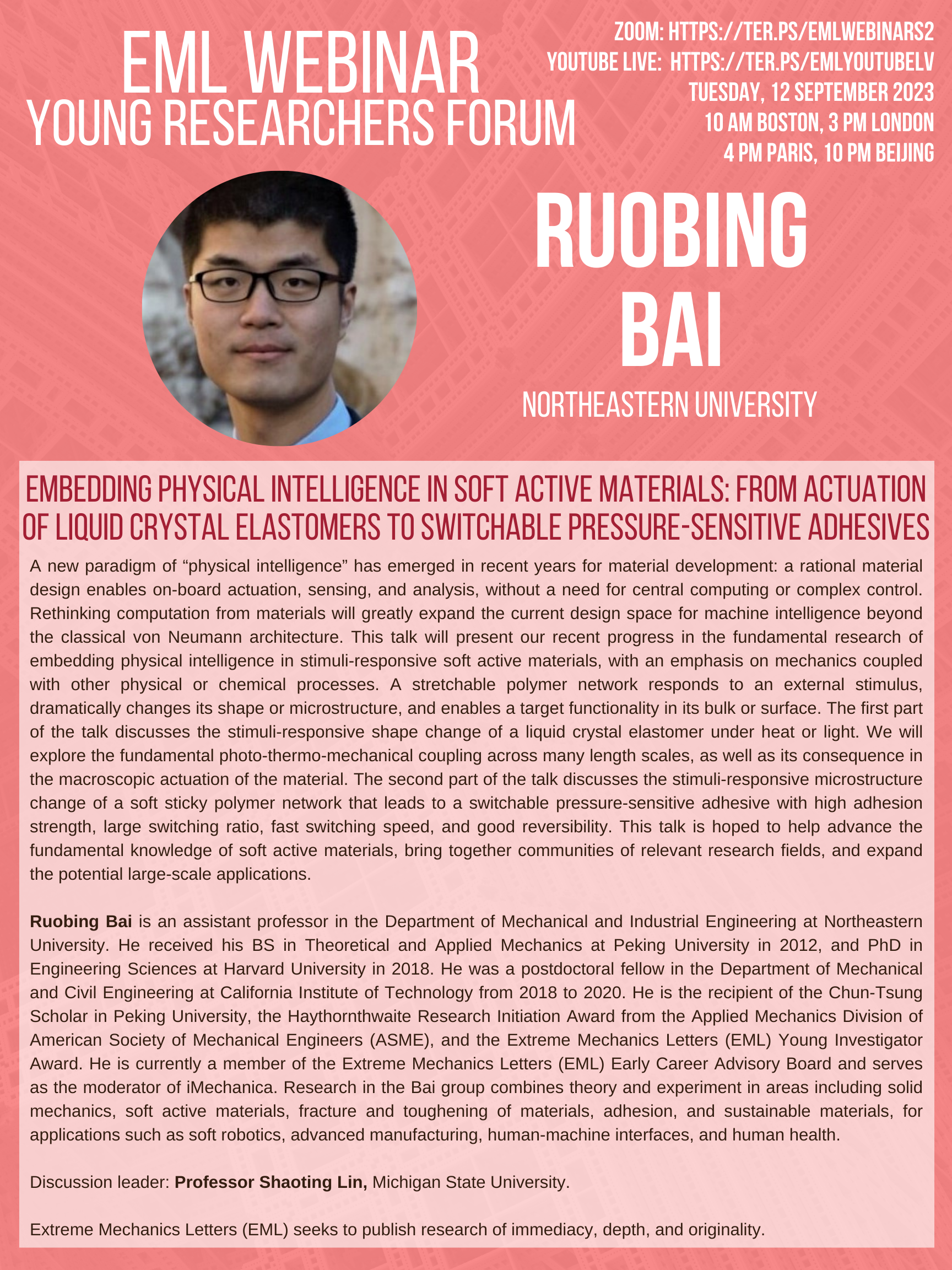 EML Webinar (Young Researchers Forum) on 12 September 2023 will be given by Ruobing Bai at Northeastern University via Zoom meeting
