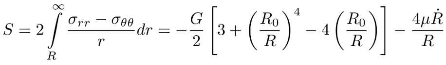 where R(t) is the bubble radius, c is the sound speed of the surroundings, ρ∞ is the density of the surroundings, γ is the surface tension, and S is the stress integral. Other models could be used to account for liquid compressibility [35,36]. As discussed in [37], the Keller-Miksis equation is an appropriate description.