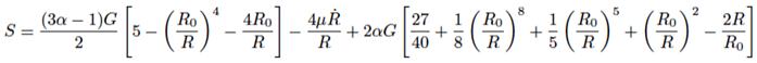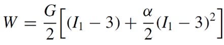where I1 is the first invariant of the right Cauchy-Green deformation tensor, i.e., I1 = λ1^2 + λ2^2 + λ3^2 and {λi} are principal stretches, G is the ground-state shear modulus, and α is a dimensionless material parameter characterizing large deformation strain-stiffening effects. The stress integral is written as: