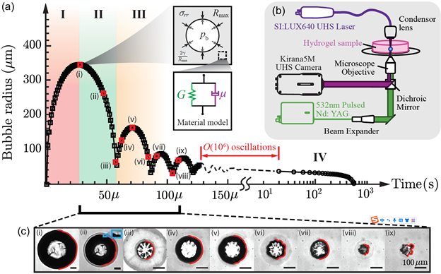 Figure 1. Laser-induced inertial cavitation experiments. (a) A representative bubble radius vs. time curve for laser-induced inertial cavitation in an 8% polyacrylamide hydrogel: (I) Initial bubble growth phase. (II-III) Bubble undergoes collapse and expansion oscillations due to the interaction between the internal gases and the surrounding viscoelastic soft matter. (IV) The bubble finally dissolves in a diffusion-driven process. (b) Experimental setup of LIC experiments (adapted from [22]). (c) Various types of non-spherical bubble shapes correspond to different time points (squares) in (a). Red lines are overlaid onto original images to visualize the shape of the bubble wall (adapted from [34]).