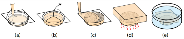 Figure 2. A graphical overview of the fabrication method for embedding a speckle plane within a gelatin hydrogel. (a) Molten gelatin is pipetted into a glass-bottom dish covered by a thin PET membrane. (b) After the gel has set, the thin PET film is removed, revealing a flat surface. (c) A speckle pattern is added to the surface and then covered with molten gelatin heated slightly above its melting temperature. (d) After the gel has been set, the entire sample is heated to the gel transition temperature and allowed to fuse. (e) The sample is placed in a cold-water bath to hydrate to equilibrium (adapted from [32]).