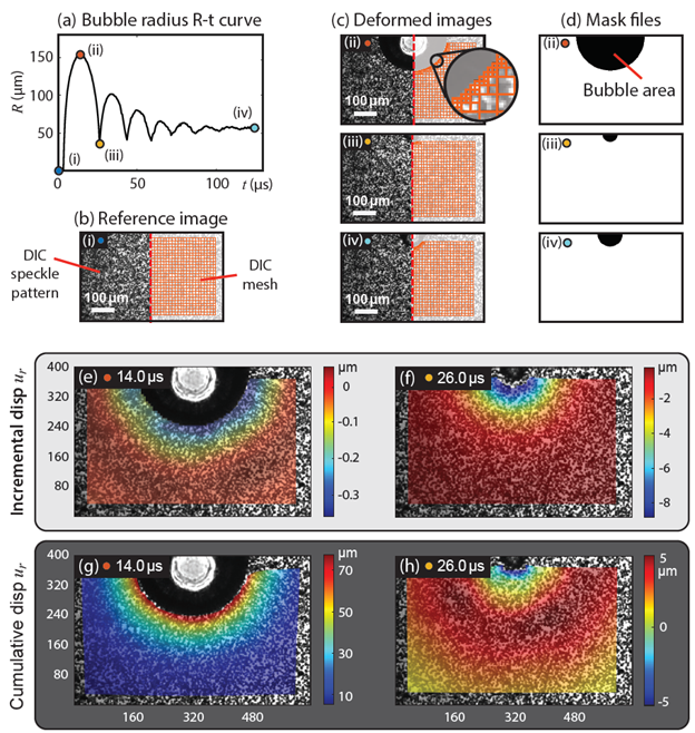 Figure 3. Digital image correlation post-processing for laser-induced inertial cavitation in gelatin hydrogels [30]. (a) A representative measured laser-induced inertial cavitation bubble radius versus time curve in a 10% gelatin hydrogel. (b) The reference virgin material and DIC mesh are shown in a split view bisecting the bubble nucleation site. (c) Insets (ii-iv): deformed raw images split with generated adaptive quadtree meshes at time points 14.0, 26.0, and 125.0 μs, respectively. (d) Examples of binary masks at 14.0, 26.0, and 125.0 μs corresponding to the data are shown in insets (ii-iv). (e–h) Measured incremental and cumulative radial displacements at 14.0 μs and 26.0 μs.