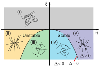 Figure 4. Phase diagram summarizing the stability of the solution a∗ := {a = 0, a,t = 0} for an inertial cavitation bubble in a nonlinear viscoelastic medium (∆ = η^2 + 4ξ).