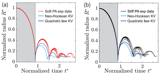 Figure 6. Normalized bubble radius versus time curves with NHKV and qKV single peak material model fits overlaid for (a) soft polyacrylamide and (b) stiff polyacrylamide hydrogels.