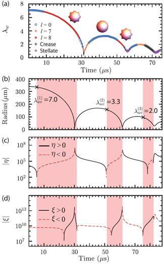 Figure 7. (a) Circumferential stretch ratio at the bubble wall (λw := R/R0) for the experiment in Fig. 1(a). Histories of (b) the bubble radius R and the quantities (c) η and (d) ξ are numerically computed using simulation parameters based on Fig. 1(a). Red-shaded regions denote situations in which nonspherical instabilities corresponding to l = 8 are predicted. The critical values of λw at the onset of instability occurring during the first three collapse cycles are shown as black x’s in (b) [34].