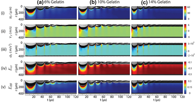 Figure 8. Kymographs of kinematic fields in three concentrations, (a) 6%, (b) 10%, and (c) 14%, of gelatin due to a single laser-induced cavitation bubble. The kymographs are created by taking a 10-pixel-wide vertical slice of the full-field data symmetric about the center of the cavitation bubble for each frame over 250 frames at a camera frame rate of 2 million frames/sec. The resulting (i) radial displacement ur, (ii) radial velocity vr, (iii) radial acceleration ar, (iv) radial logarithmic strain Err, and (v) circumferential logarithmic strain Eθθ fields are plotted against time for all three gelatin concentrations. The cavitation bubble is shown as the black and grey region at the top of each series in all of these kymographs.
