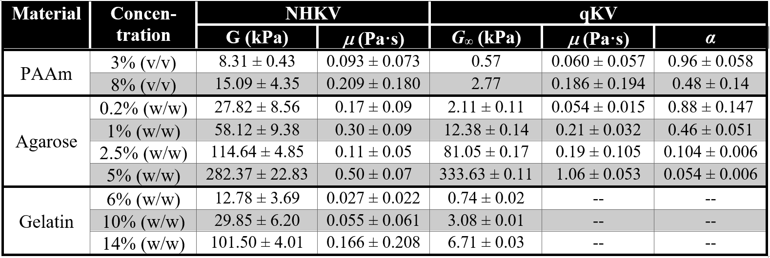 By fitting the bubble radius vs. time curve beginning from the first peak to close to the first collapse, we obtain the viscoelastic properties of hydrogels using both neo-Hookean Kelvin–Voigt (NHKV) and quadratic law Kelvin–Voigt (qKV) models, where all of the fitted parameters are summarized in Figs. 5-6 and Table 1. The fitted, dynamic shear moduli predicted from the neo-Hookean Kelvin–Voigt model are one order of magnitude stiffer than their quasi-static counterparts. Furthermore, the large standard deviation of the possible dynamic shear modulus values for the case of the stiff PA gel might lend additional credence to choosing a strain stiffening constitutive model. Thus, using the quadratic law Kelvin–Voigt model, this issue is remedied by keeping the equilibrium shear modulus fixed, and introducing the parameter α (see Eq. (3)) to account for strain stiffening effects (Fig. 5) explicitly.