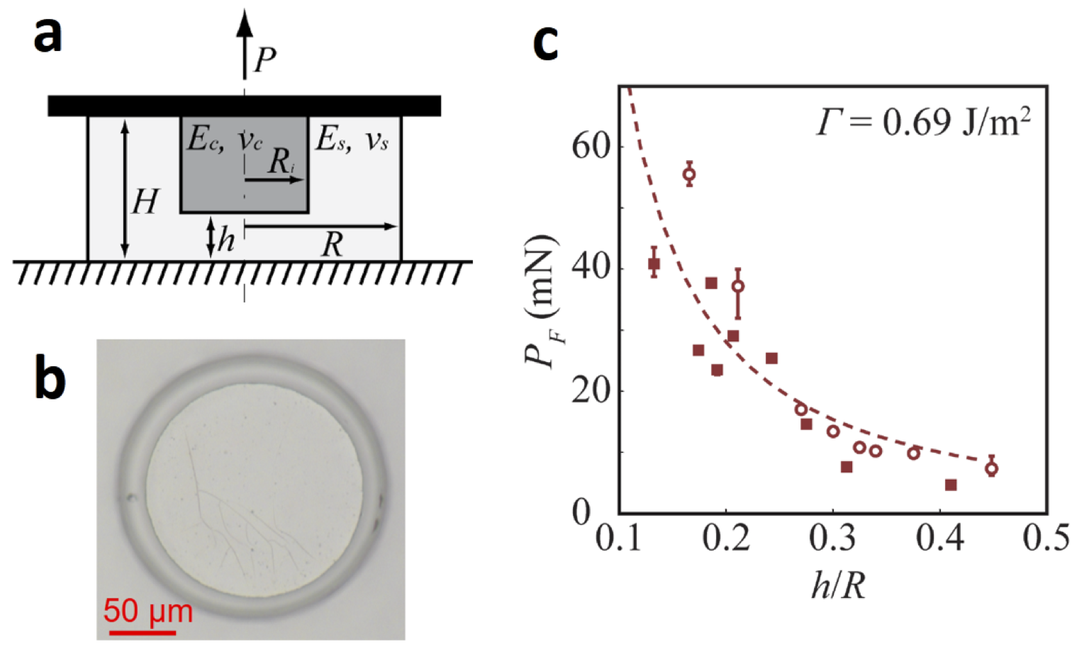 Figure 1: (a) Schematic and (b) Optical micrograph (end on view) of a 200 µm diameter composite pillar containing a rigid core. (c) Experimental (markers) and finite element simulation (dashed line) results showing increase in adhesion with decreasing shell thickness, h. [3]